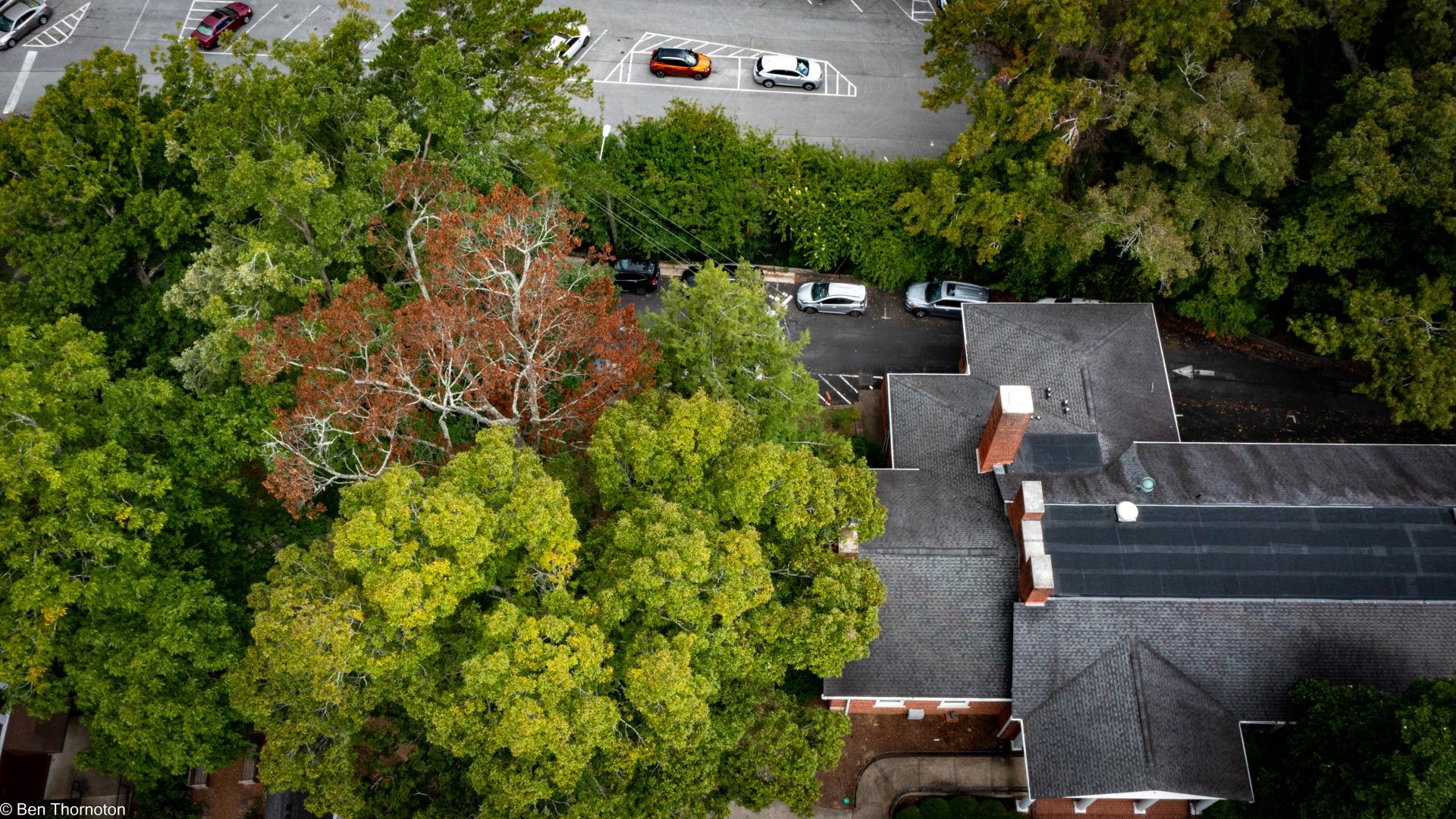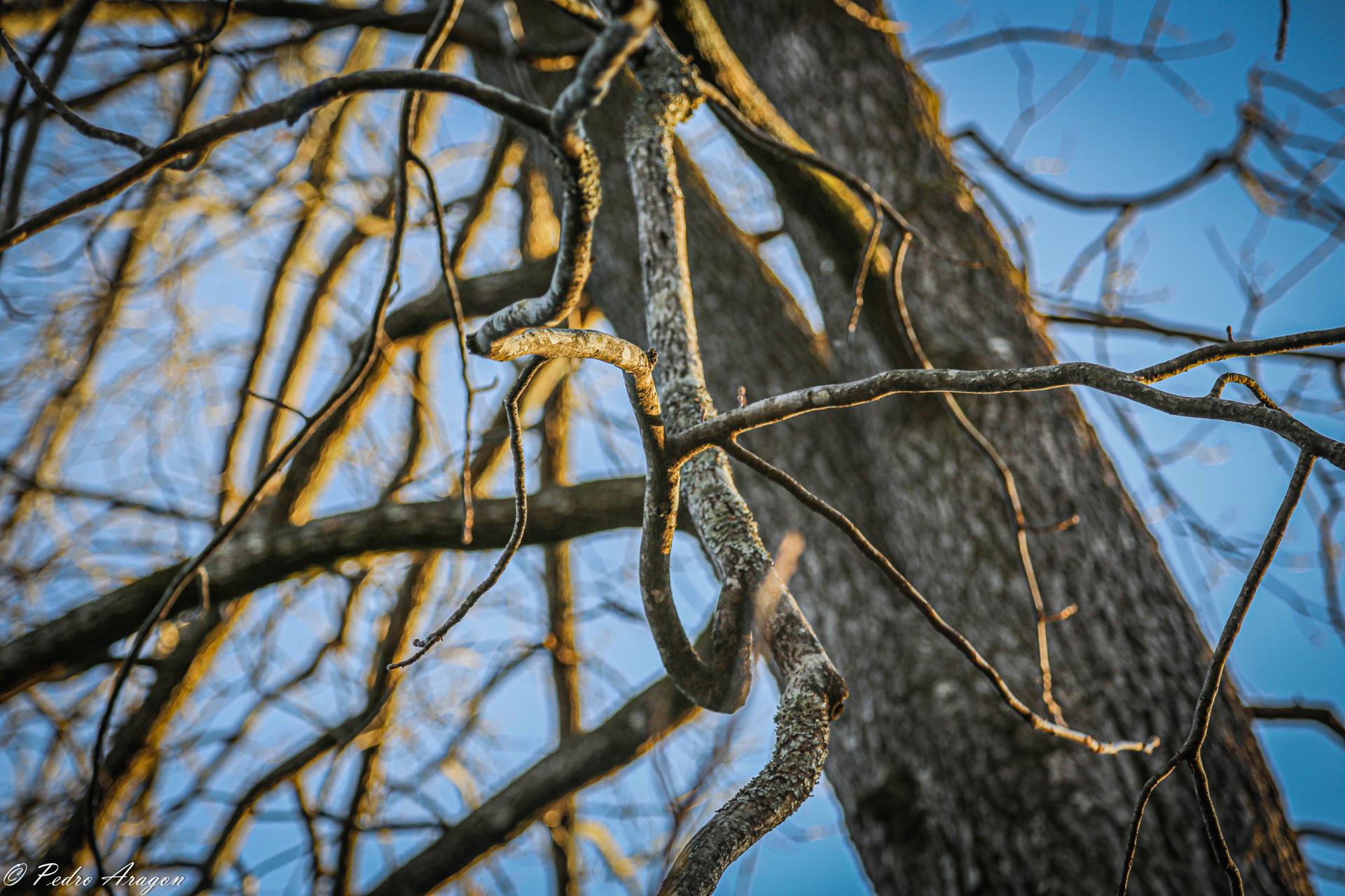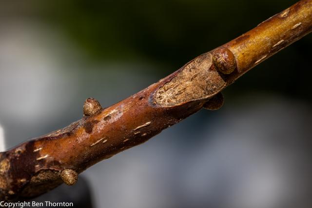 The bark of mature trees is grey, composed of tight, flat-topped intersecting ridges that can appear quite blocky but are generally strap-like. Occasionally, the ridges may separate from the trunk in peeling strips, loose at both ends, a trait characteristic of Shagbark and Shellbark Hickories. Young, vigorously growing trees are more prone to producing peeling bark than mature individuals.