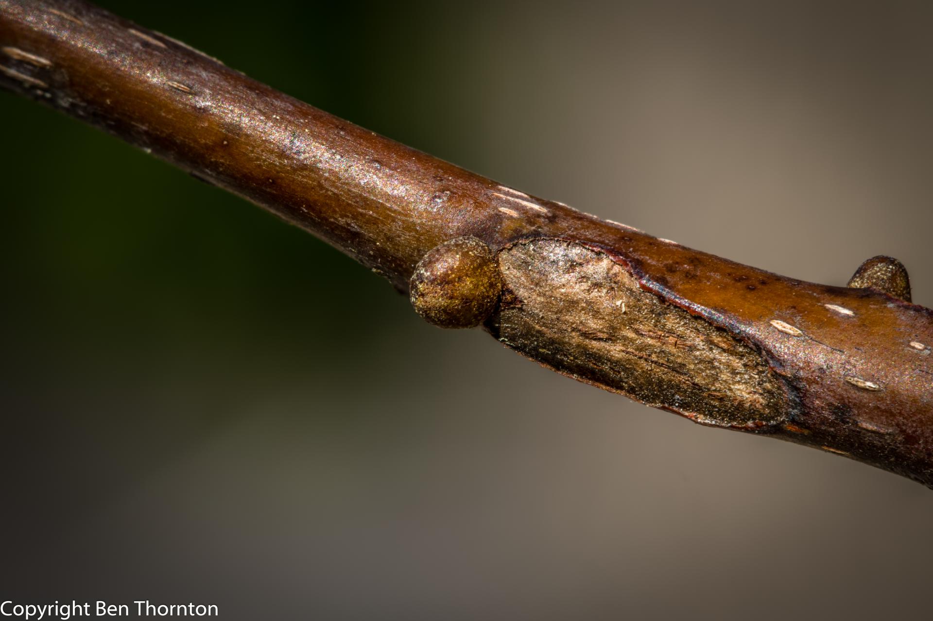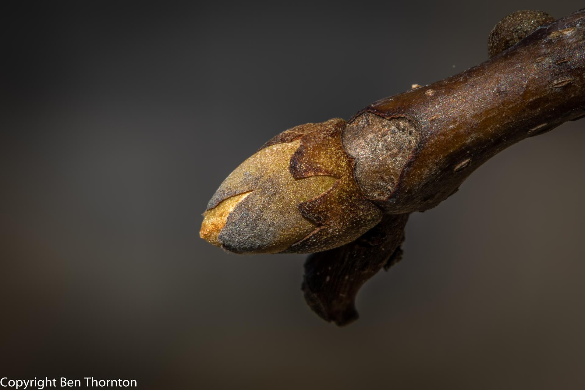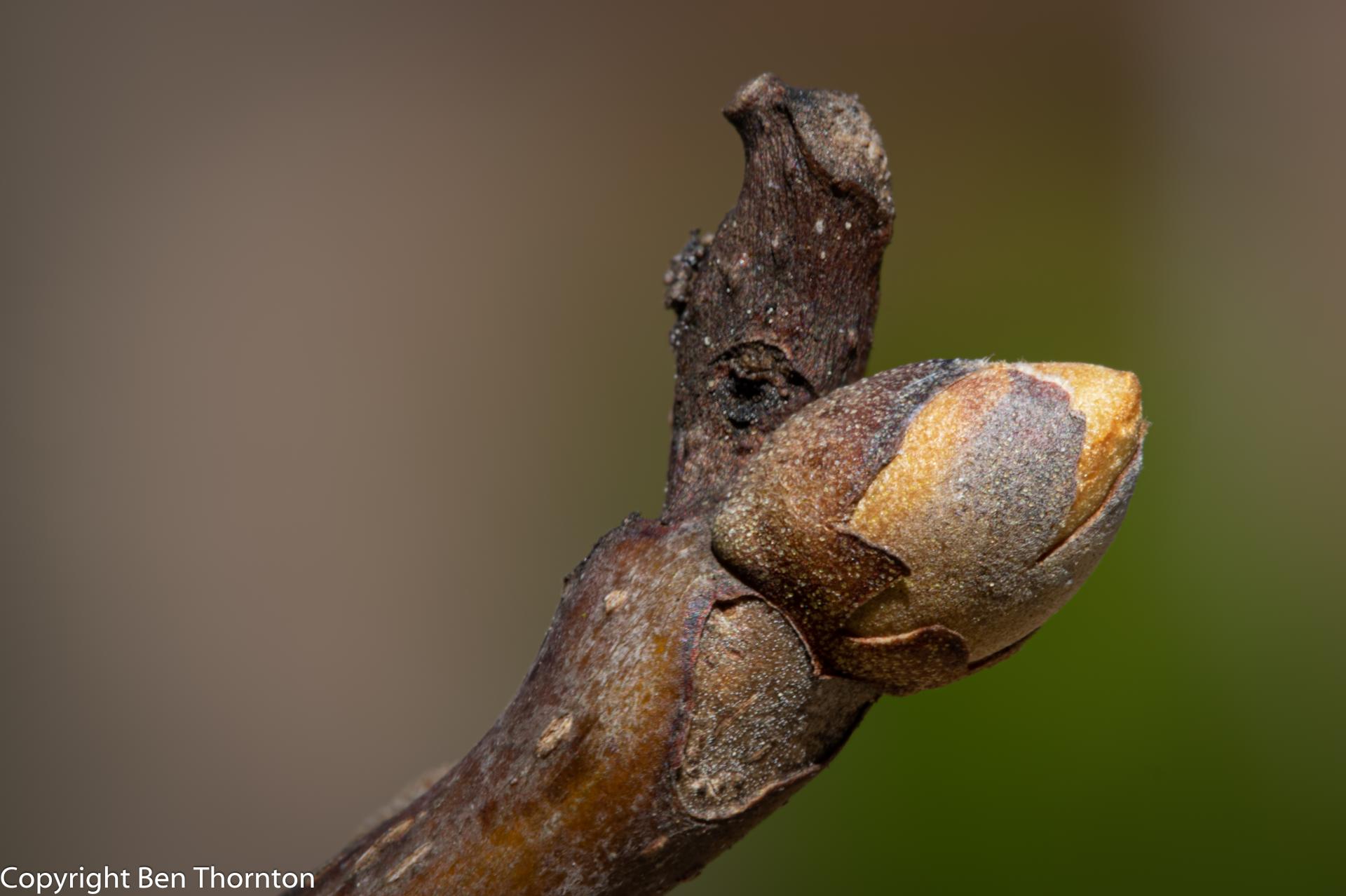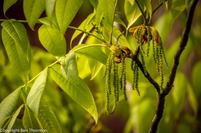 The flowers emerge in the spring at the same times as the developing leaves (early to late May). The male flowers are long, green, inconspicuous drooping catkins that develop between the base of the petiole and the developing twig. The female flowers are bizarre looking, with a tuft of sticky green tissue emerging from a swollen base. These develop individually or in groups at the end of a new twig, after the expanding leaves. All hickories are self-infertile and monoecious.