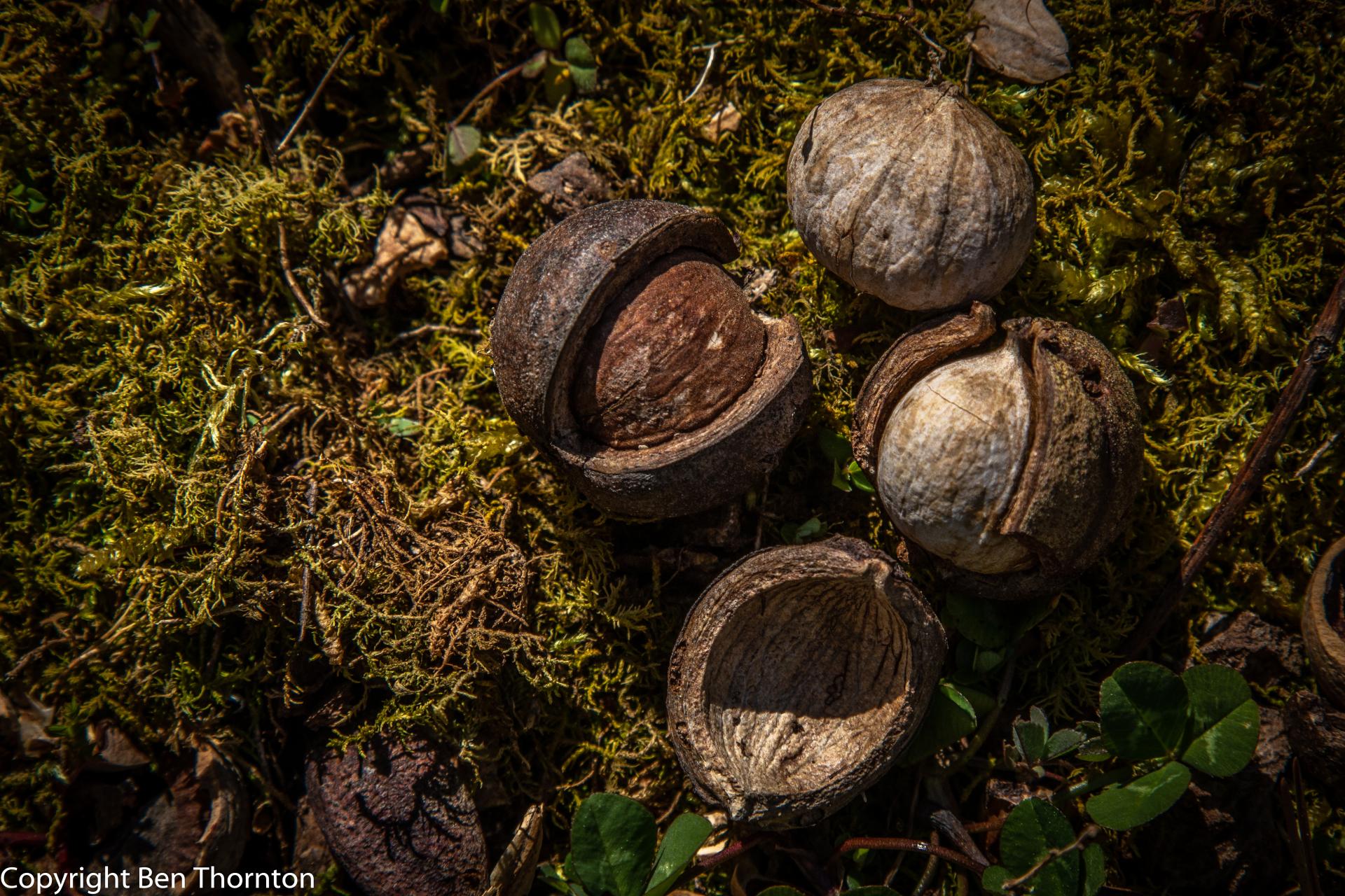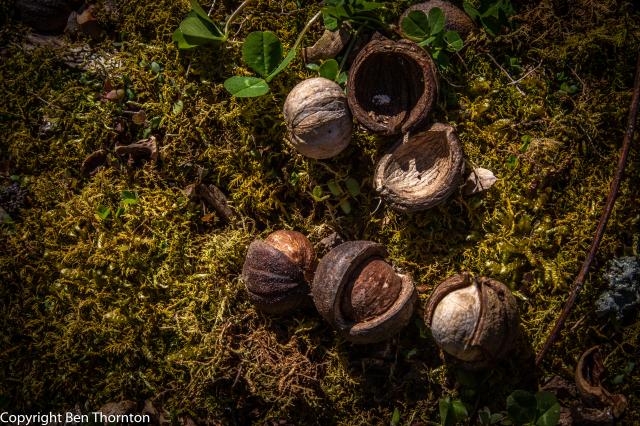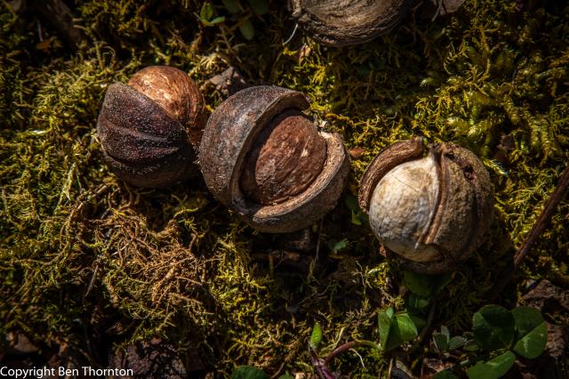 Like all hickories, the fruit is a small round or slightly elliptical nut, born singly or in groups of 2-3 on the ends of bearing branches. When immature, the nut is encased in a thin, green husk with 4 distinct seams. Upon maturity (late September to mid-October) the husk changes from being green, fleshy and flexible to dark brown and very brittle. The seams then split from the base upwards and may or may not completely separate from the ripe nut. The nut itself is smooth, tan to beige in color and has 4 shallow ridges from the seams. The inner kernel is very oily and varies in flavor from bitter and unpalatable to mildly sweet. For such as small nut, the shell is thick and the kernel difficult to extract. These nuts are relished by countless wildlife species, including many rodents and birds, as well as raccoons and wild turkeys.