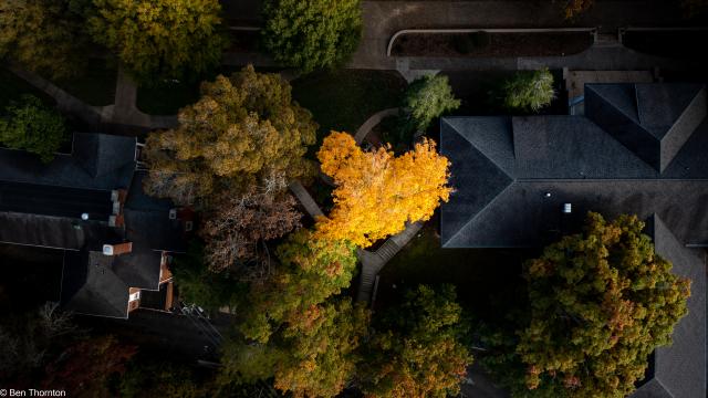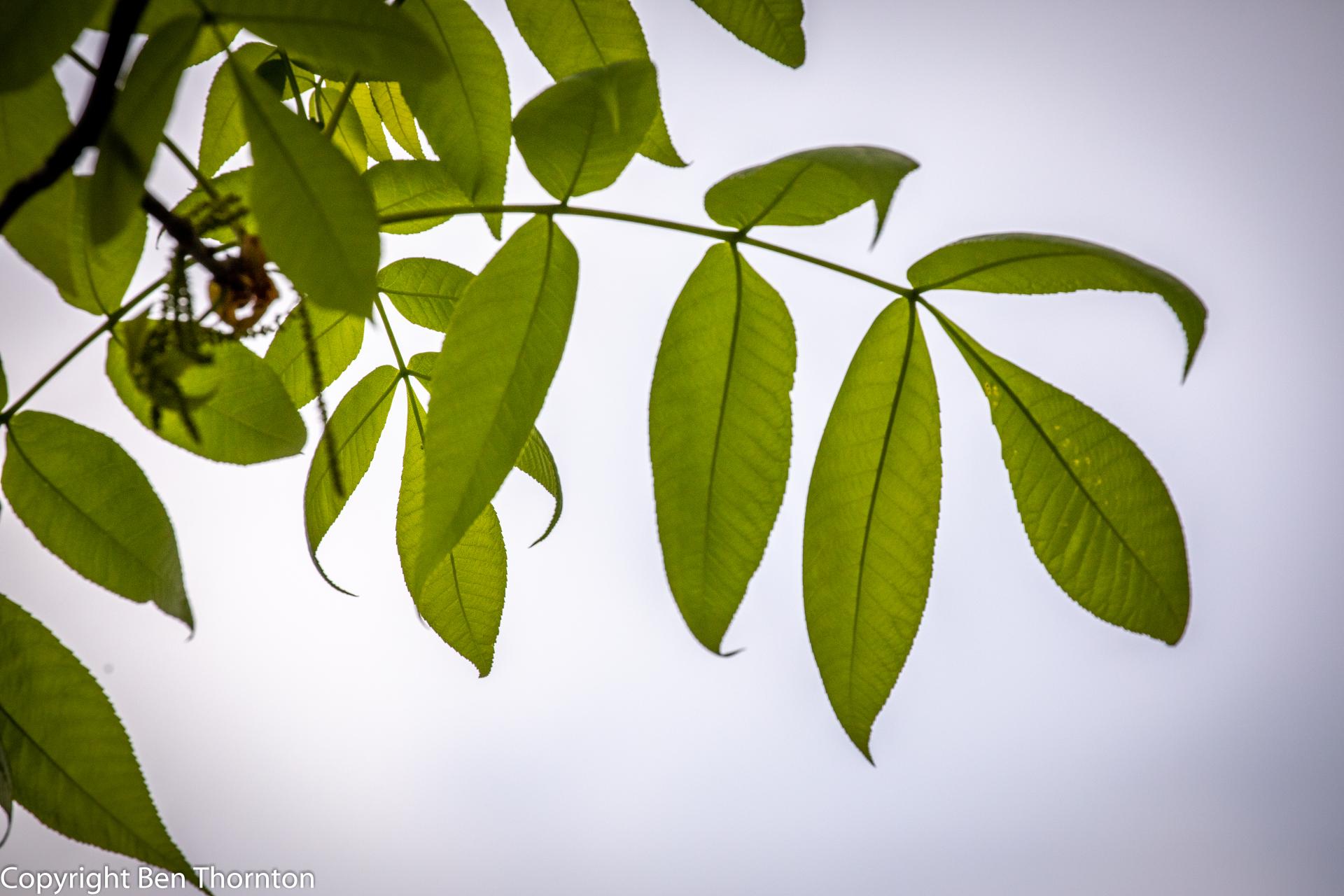 The leaves are pinnately compound, typically producing 5-9 leaflets (7 being the most common). The terminal leaflet is often the largest, with the auxiliary leaflets decreasing in size from the tip to the base of the rachis. Leaflets are broadest above or at their median length, with finely serrated margins. They are dark green and smooth or glaucous above and paler and finely pubescent underneath. The rachis of the leaves are usually bright red or purple in color, a distinctive feature of red hickory that helps to separate it from pignut hickory.[6]