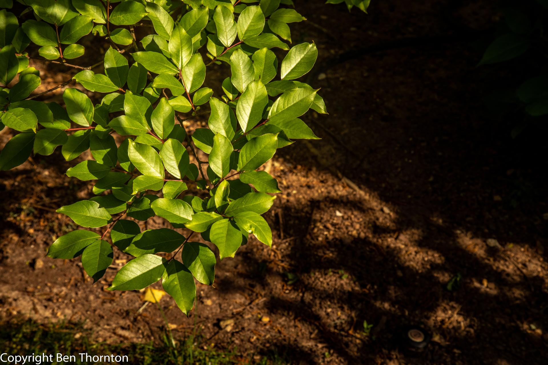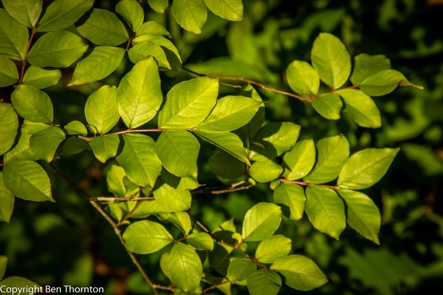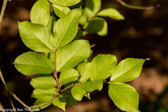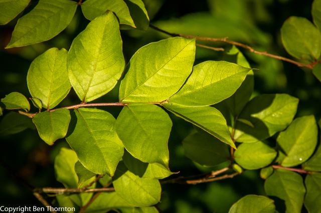 The bark is thin and about 2mm. thick, smooth, pinkish-gray and mottled, shedding each year. Leaves also shed each winter, after spectacular color display, and bare branches re-leaf early in the spring; leaves are small, smooth-edged, circular or oval-shaped, and dark green changing to yellow and orange and red in autumn.