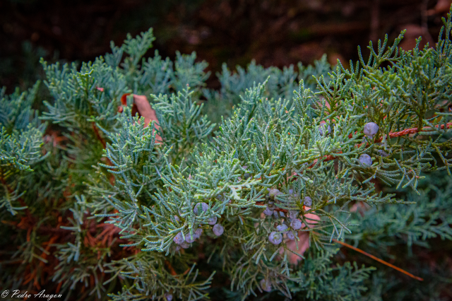 Juniperus virginiana is a dense slow-growing coniferous evergreen tree that may never become more than a bush on poor soil, but is ordinarily from 5–20 metres (16–66 feet) tall, with a short trunk 30–100 centimetres (12–39 inches) in diameter, rarely to 27 m (89 ft) in height and 170 cm (67 in) in diameter. The oldest tree reported, from West Virginia, was 940 years old.[8] The bark is reddish-brown, fibrous, and peels off in narrow strips. The leaves are of two types; sharp, spreading needle-like juvenile leaves 5–10 millimetres (3⁄163⁄8 in) long, and tightly adpressed scale-like adult leaves 2–4 mm (1⁄163⁄16 in) long; they are arranged in opposite decussate pairs or occasionally whorls of three. The juvenile leaves are found on young plants up to 3 years old, and as scattered shoots on adult trees, usually in shade. The seed cones are 3–7 mm (1⁄81⁄4 in) long, berry-like, dark purple-blue with a white wax cover giving an overall sky-blue color (though the wax often rubs off); they contain one to three (rarely up to four) seeds, and are mature in 6–8 months from pollination. The juniper berry is an important winter food for many birds, which disperse the wingless seeds. The pollen cones are 2–3 mm (1⁄161⁄8 in) long and 1.5 mm (1⁄16 in) broad, shedding pollen in late winter or early spring. The trees are usually dioecious, with pollen and seed cones on separate trees,[5][6][7] yet some are monoecious.