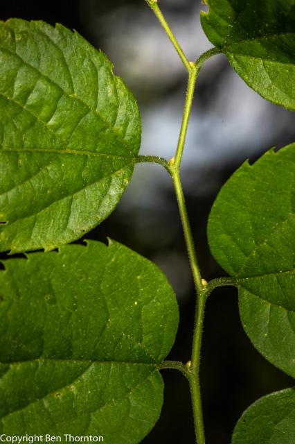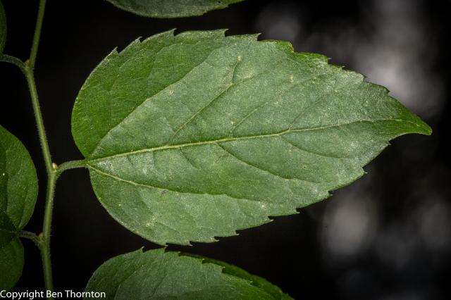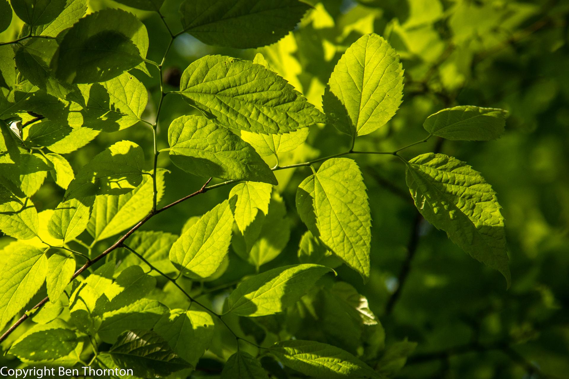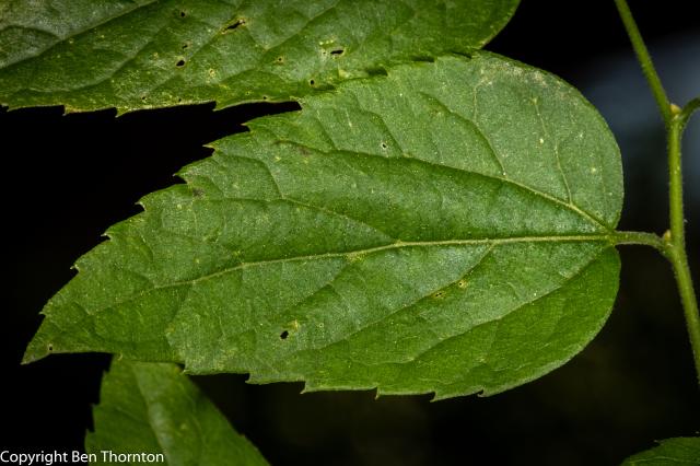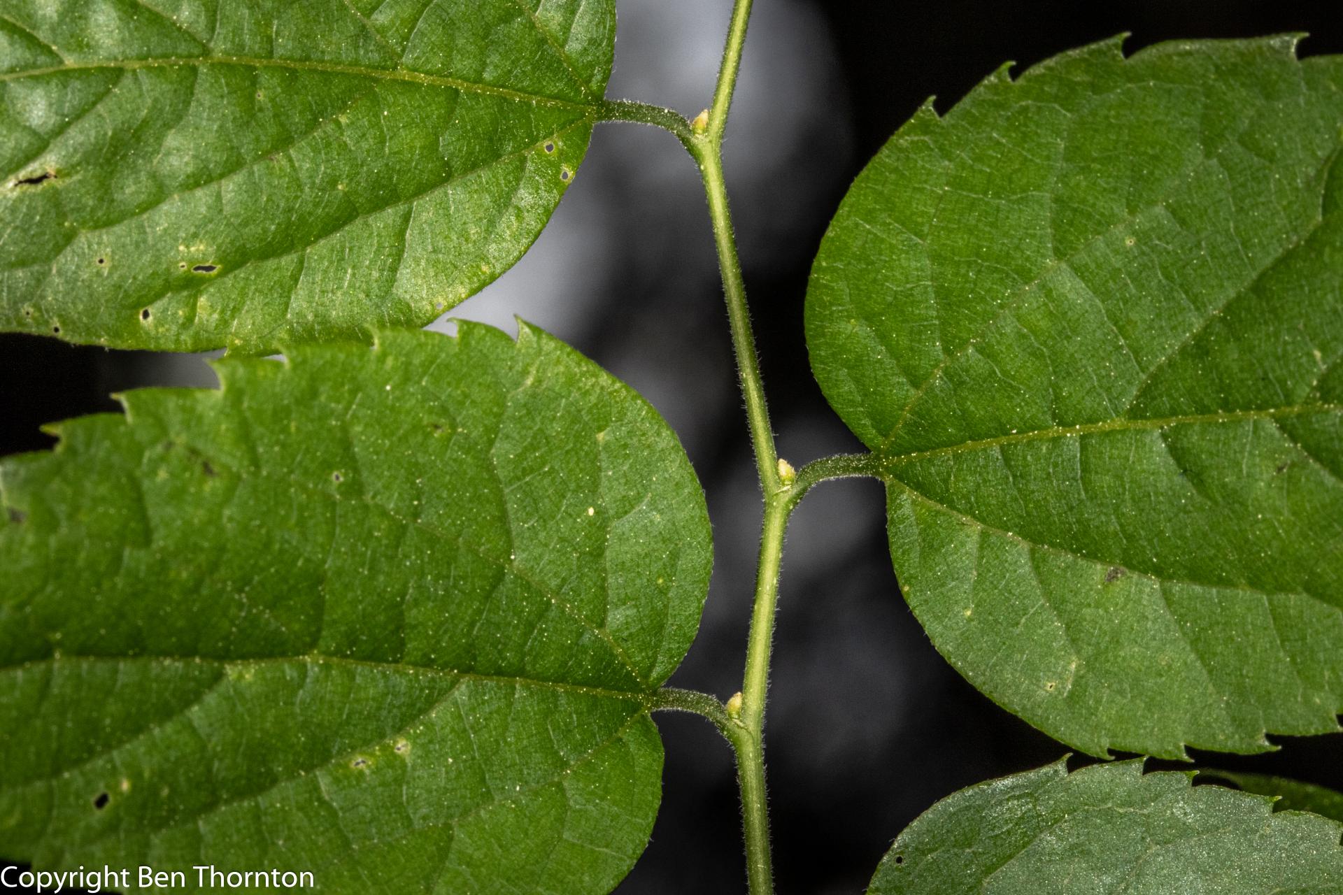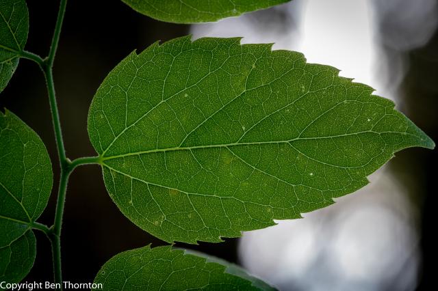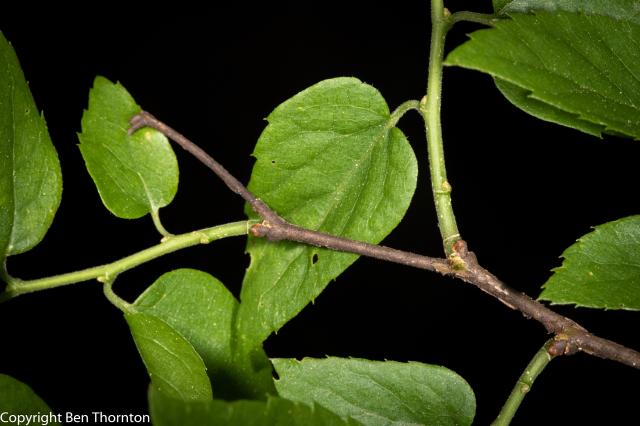 The leaves are alternately arranged on the branchlets, ovate to ovate-lanceolate, often slightly falcate,[6] 5–12 cm (2–4+3⁄4 in) long by 3–9 cm (1+1⁄43+1⁄2 in),[7] very oblique at the base, with a pointed tip. The margin is serrate (toothed), except at the base which is mostly entire (smooth). The leaf has three nerves, the midrib and primary veins prominent. The leaves come out of the bud conduplicate with slightly involute margins, pale yellow green, downy; when full grown are thin, bright green, rough above, paler green beneath. In autumn they turn to a light yellow. Petioles slender, slightly grooved, hairy. Stipules varying in form, caducous.[6]