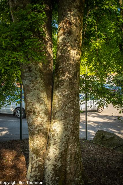 The bark is light brown or silvery gray, broken on the surface into thick appressed scales and sometimes roughened with excrescences; the pattern is very distinctive.[6] The remarkable bark pattern is even more pronounced in younger trees, with the irregularly-spaced ridges resembling long geologic palisades of sedimentary [layered] rock formations when viewed edge-wise [cross-section]. Coins as large as U.S. quarters can easily be laid flat against the valleys, which may be as deep as an adult human finger.