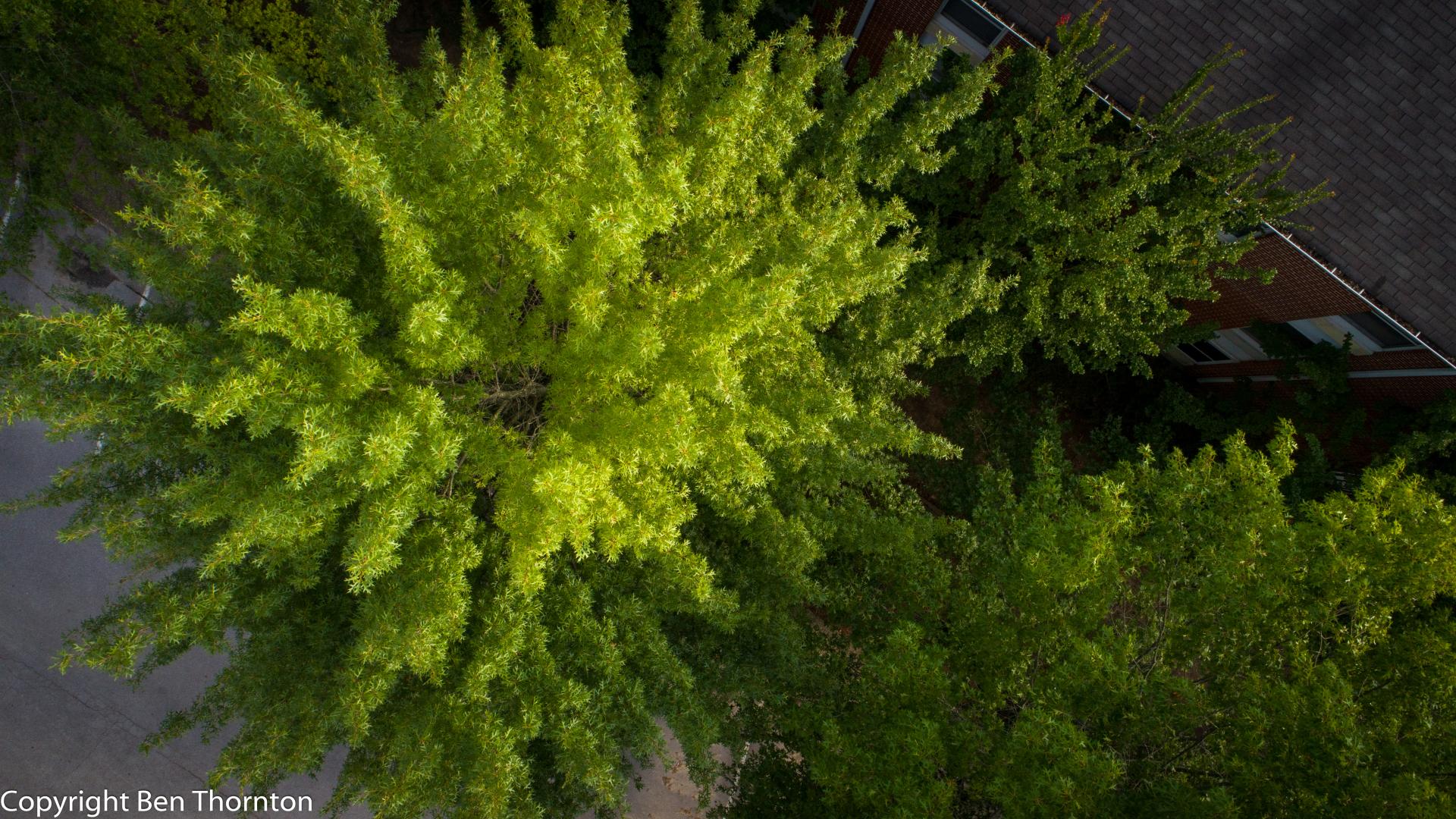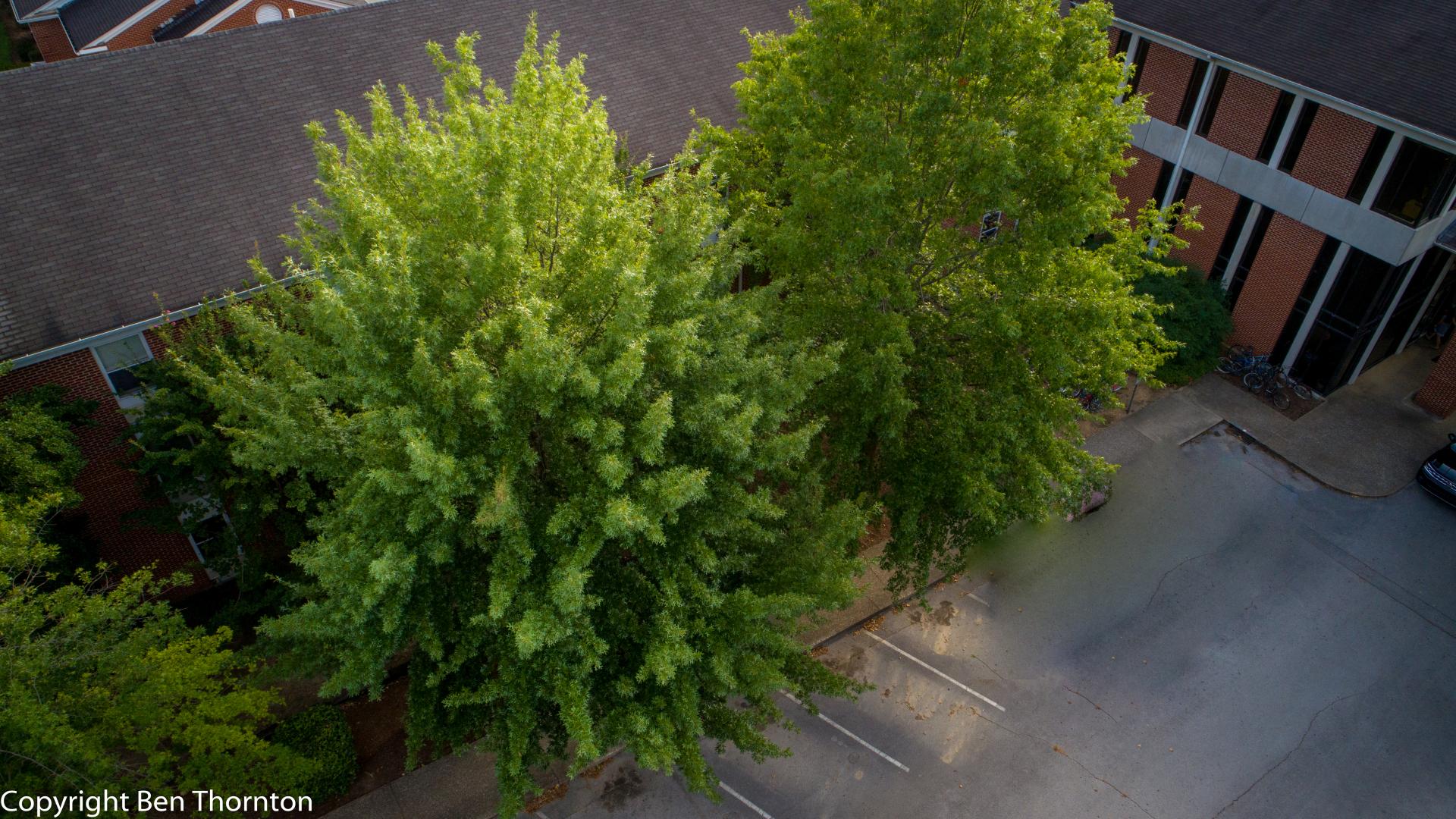 By the time the tree is 40 years old, it develops more rough bark with a loose, spreading canopy. This canopy is considered one of the most distinctive features of the pin oak: the upper branches point upwards, the middle branches are at right angles to the trunk, and the lower branches droop downwards.[6][7]