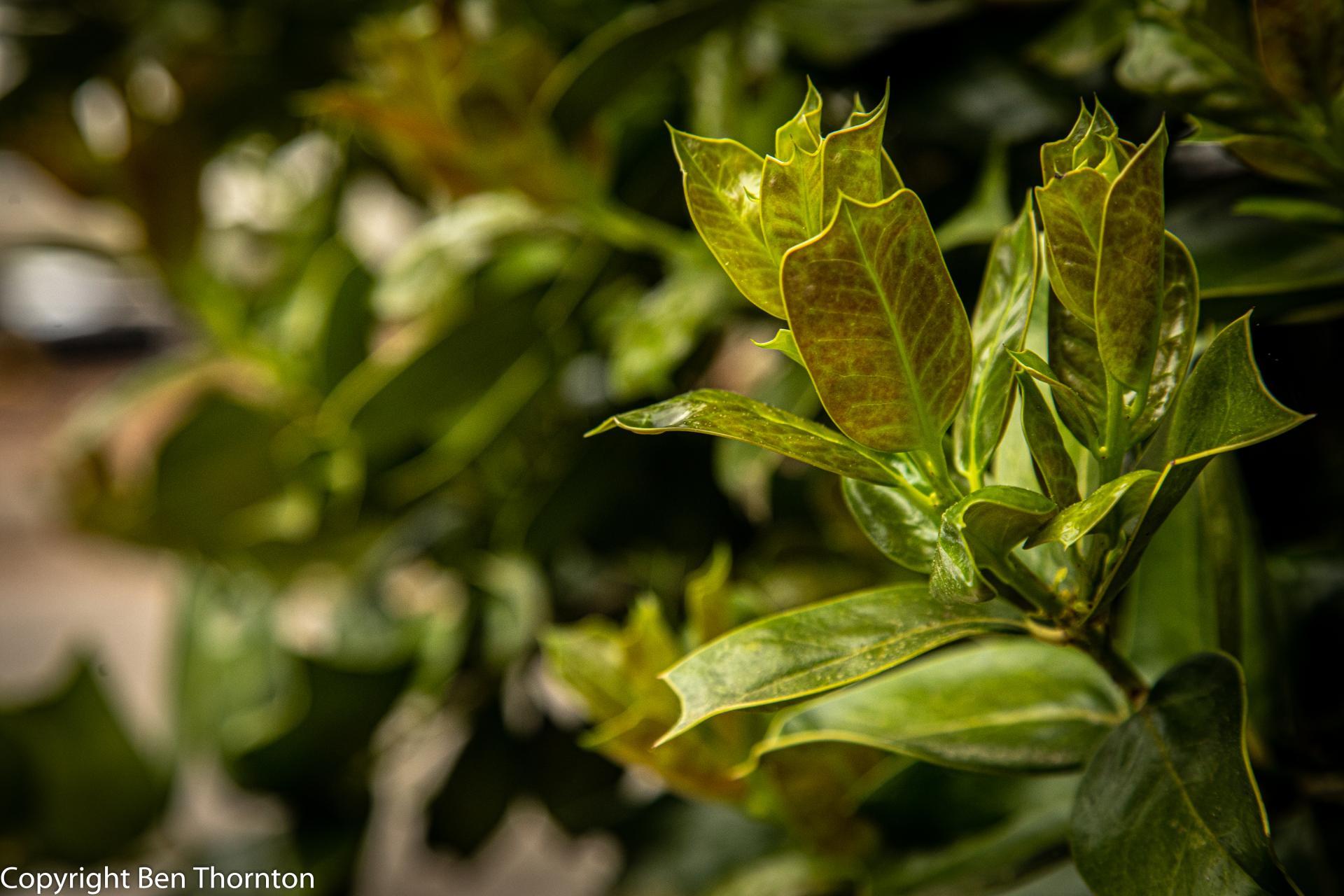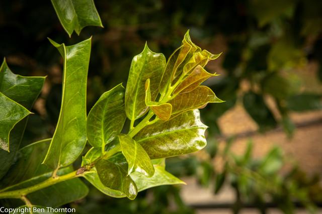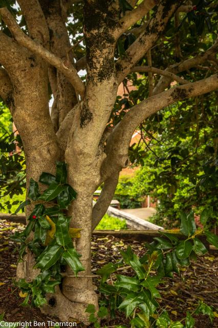 The bark is a light gray color and smooth. As it grows, the bark turns into a finely flaky appearance. The stem of Ilex cornuta is either green or a red to burgundy color depending on the season. The green stems turn slightly more red during the winter months.[7]