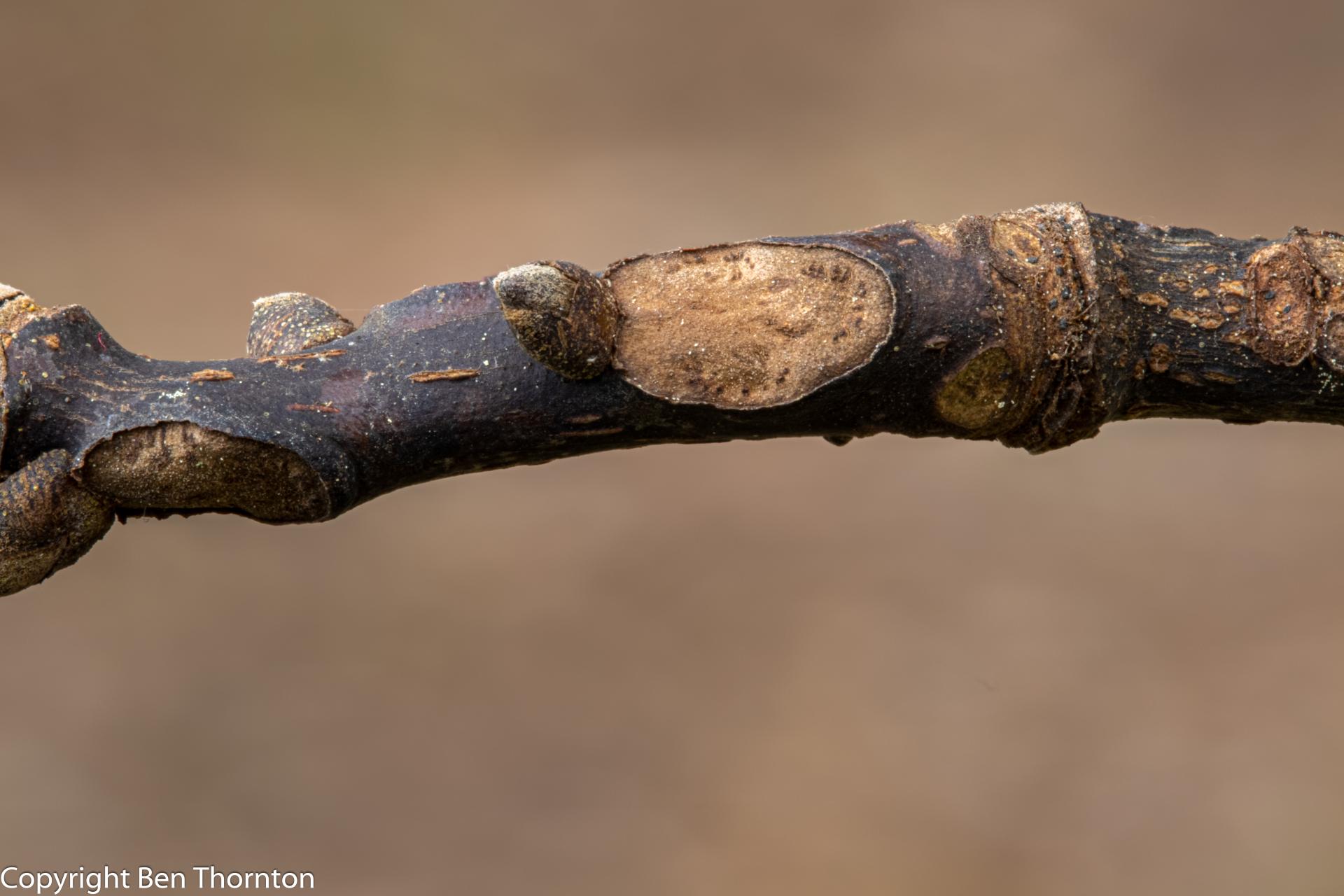 The stem canker (Nectria galligena) produces depressed areas with concentric bark rings that develop on the trunk and branches. Affected trees are sometimes eliminated through breakage or competition and sometimes live to reach merchantable size with cull section at the canker. No special control measures are required, but cankered trees should be harvested in stand improvement operations.