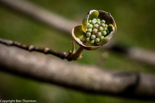 The flowers are individually small, inconspicuous, and a hermaphrodite, with four, greenish-yellow petals (not bracts) 4 mm (0.16 in) long. Around 20 flowers are produced in a dense, rounded, umbel-shaped inflorescence, or flower-head, 1–2 cm (0.39–0.79 in) in diameter. The flower-head is surrounded by four conspicuous large white, pink or red bracts (not petals), each bract 3 cm (1.2 in) long and 2.5 cm (0.98 in) broad, rounded, and often with a distinct notch at the apex.