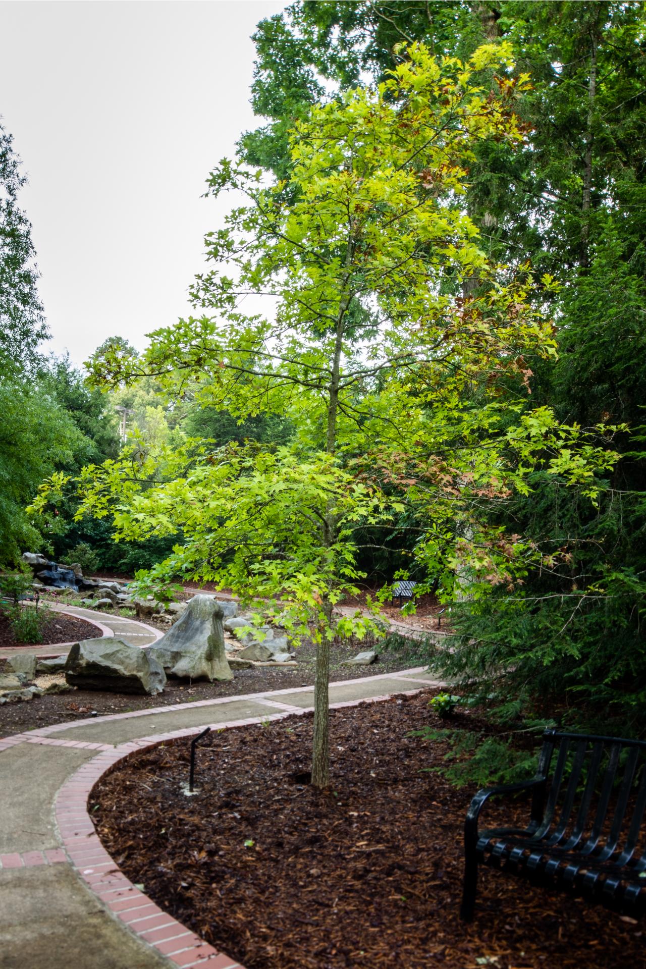 Quercus palustris is a medium-sized deciduous tree growing to 18–22 metres (59–72 feet) tall, with a trunk up to 1 m (3+1⁄2 ft) in diameter. It has an 8–14 m (26–46 ft) spread. A 10-year-old tree grown in full sun will be about 8 m (26 ft) tall. Young trees have a straight, columnar trunk with smooth bark and a pyramidal canopy.