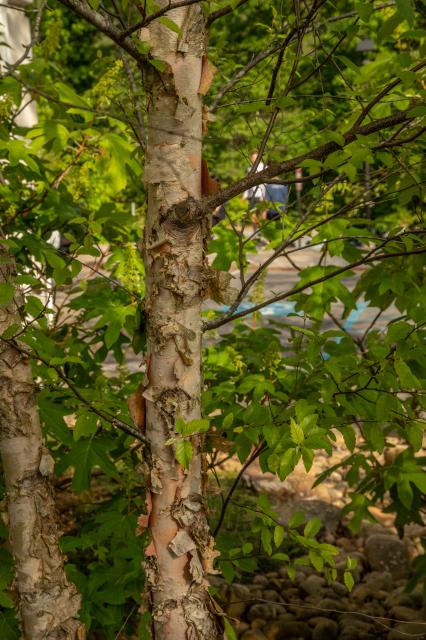 Bark characteristics of the river birch differ during its youth stage, maturation, and old growth. The bark of a young river birch can vary from having a salmon-pink to brown-gray tint and can be described as having loose layers of curling, paper thin scales. As the tree matures, the salmon-pink color is exchanged for a reddish-brown with a dark grey base color. The scales on a mature tree lack the loose curling and are closely pressed into thick, irregular plates. These scales are slightly separated from the trunk and can shift outward to the side. Once the river birch ages past maturity, the scales become thicker towards the base of the trunk and are divided in deep furrows.[3]