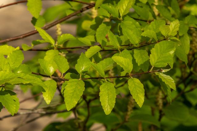 The twigs are glabrous or thinly hairy. There is an absence of terminal buds, and lateral buds often have a hook at the tip of the bud, which differs from other species in the family Betulaceae.[4] The leaves are alternate, ovate, 4–8 centimeters (1+1⁄23+1⁄4 in) long and 3–6 centimeters (1+1⁄42+1⁄4 in) broad, with a serrated margin and five to twelve pairs of veins. The upper surface of the leaf is dark green in color, while the underside can be described as having a light yellow-green color.[5] The leaves turn yellow in Autumn. The flowers are wind-pollinated catkins 3–6 centimeters (1+1⁄42+1⁄4 in) long, the male catkins pendulous, the female catkins erect. The fruit is unusual among birches in maturing in late spring; it is composed of numerous tiny winged seeds packed between the catkin bracts.[2][6]