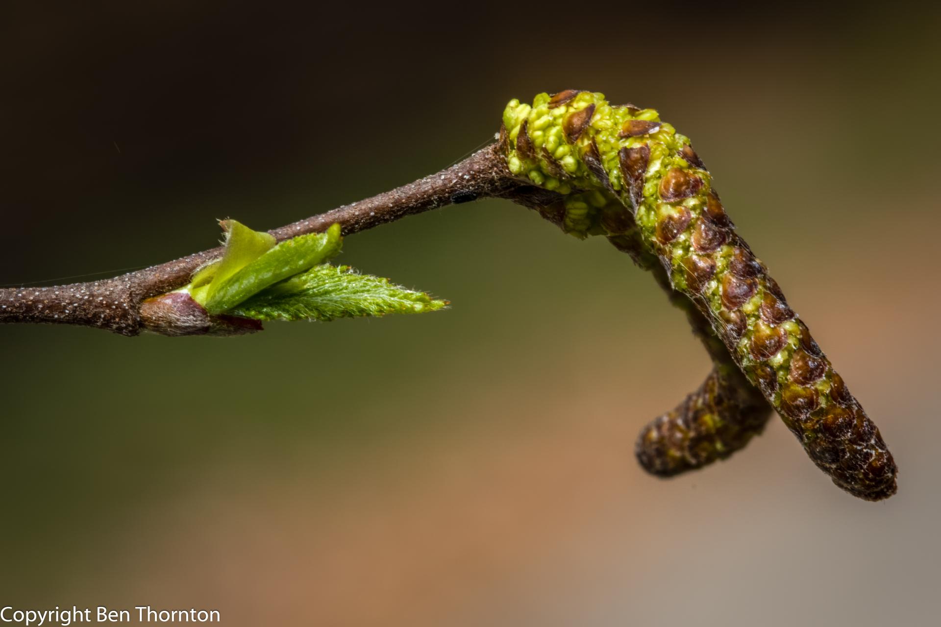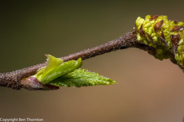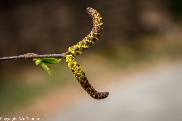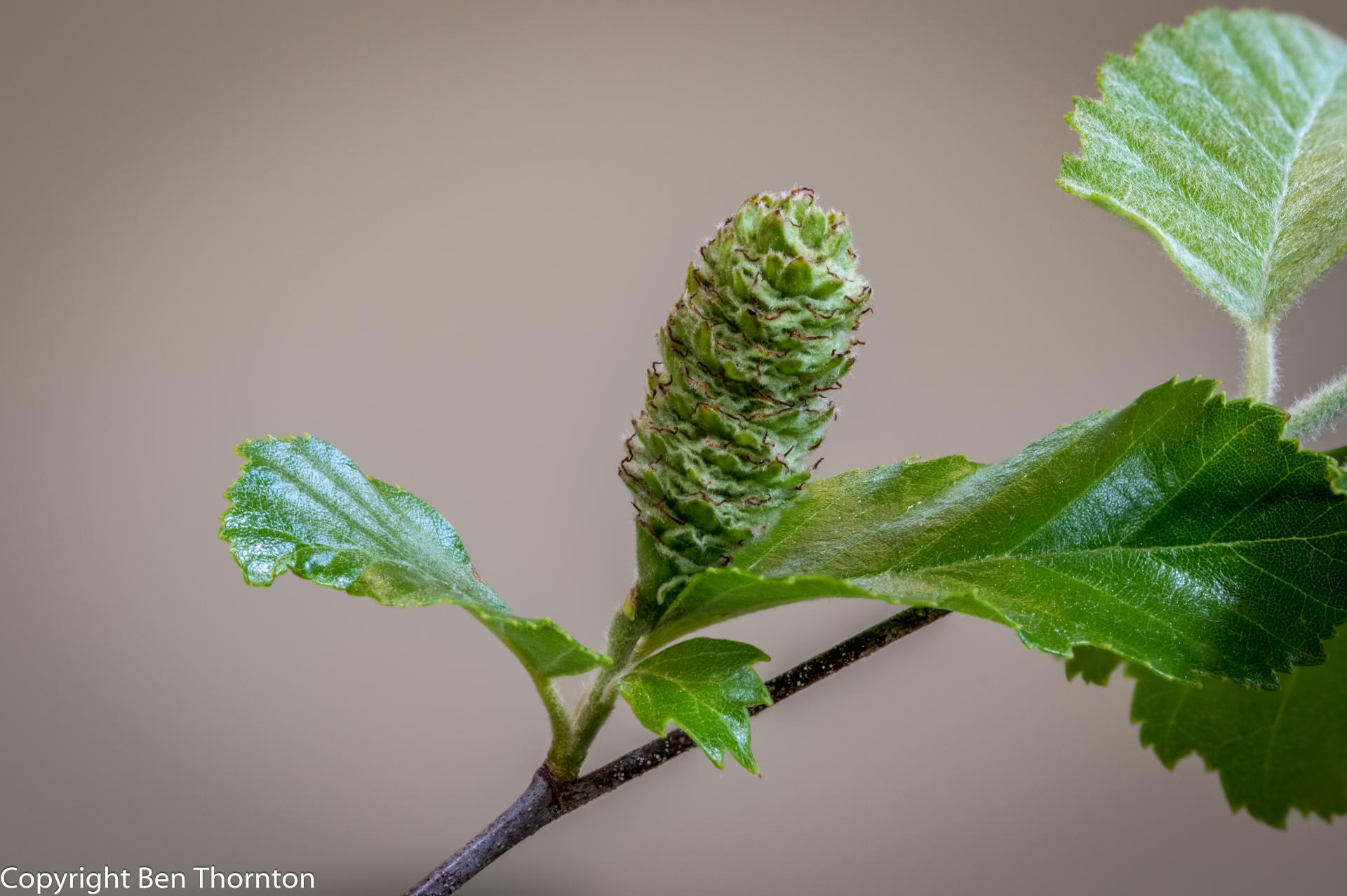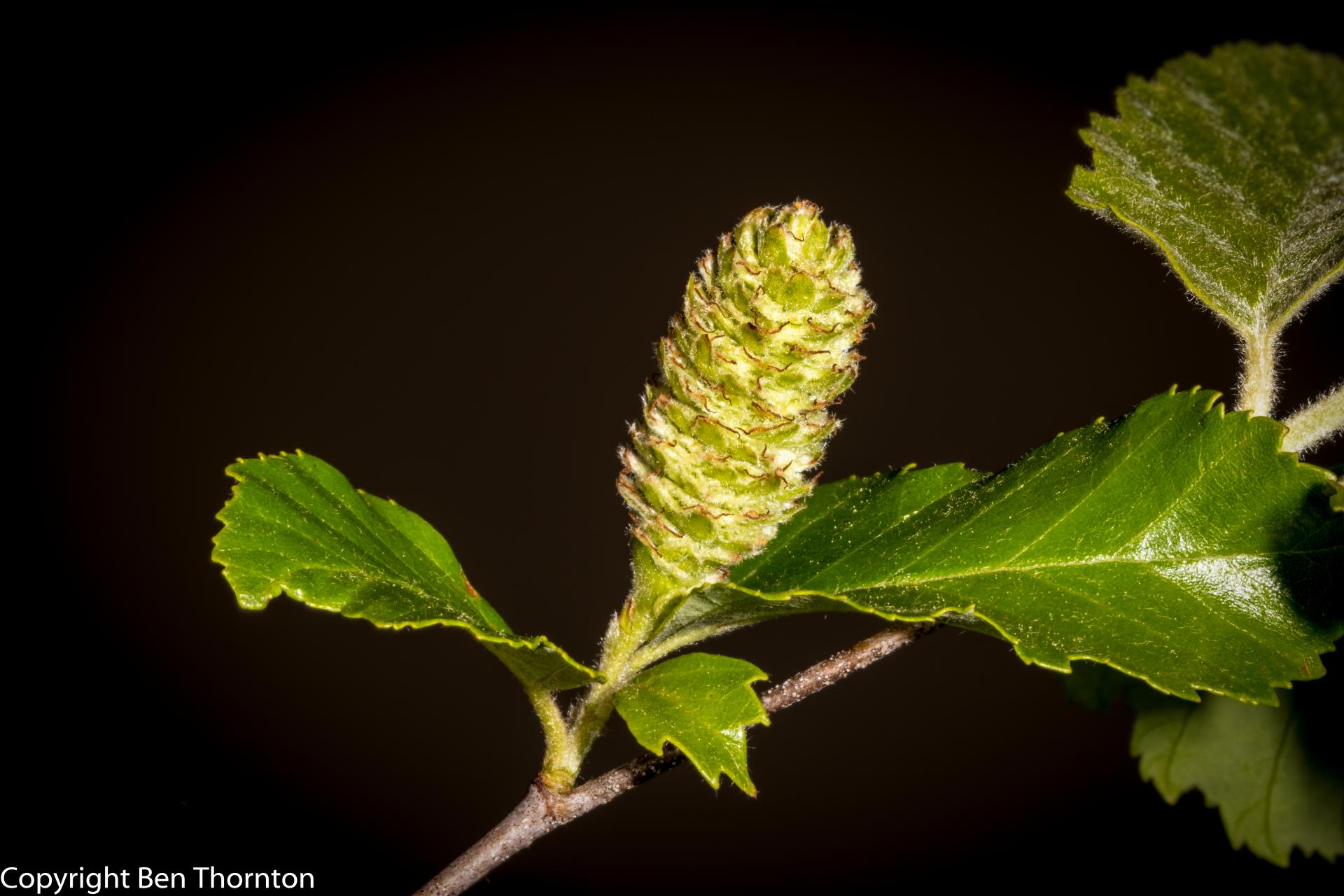 The twigs are glabrous or thinly hairy. There is an absence of terminal buds, and lateral buds often have a hook at the tip of the bud, which differs from other species in the family Betulaceae.[4] The leaves are alternate, ovate, 4–8 centimeters (1+1⁄23+1⁄4 in) long and 3–6 centimeters (1+1⁄42+1⁄4 in) broad, with a serrated margin and five to twelve pairs of veins. The upper surface of the leaf is dark green in color, while the underside can be described as having a light yellow-green color.[5] The leaves turn yellow in Autumn. The flowers are wind-pollinated catkins 3–6 centimeters (1+1⁄42+1⁄4 in) long, the male catkins pendulous, the female catkins erect. The fruit is unusual among birches in maturing in late spring; it is composed of numerous tiny winged seeds packed between the catkin bracts.[2][6]