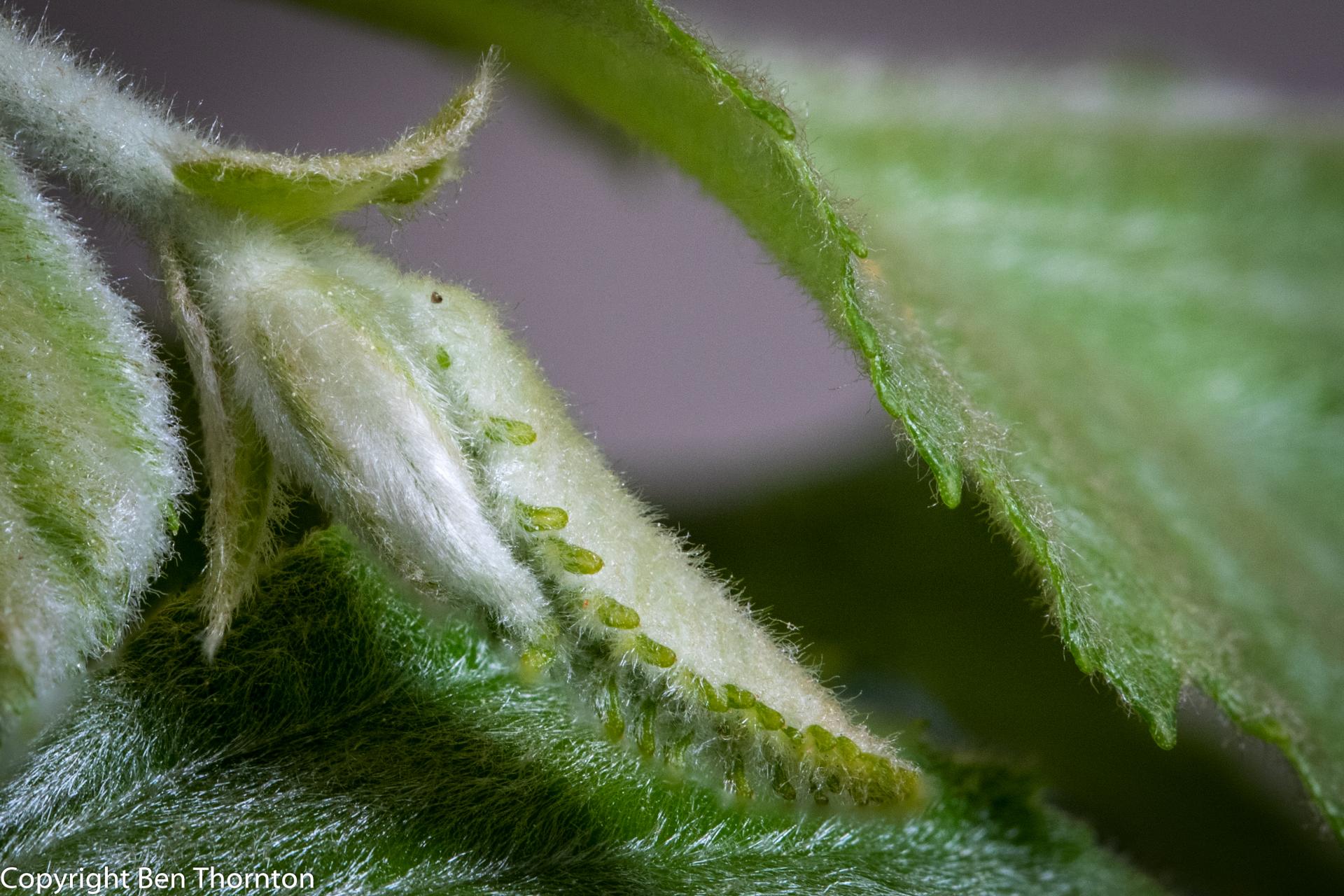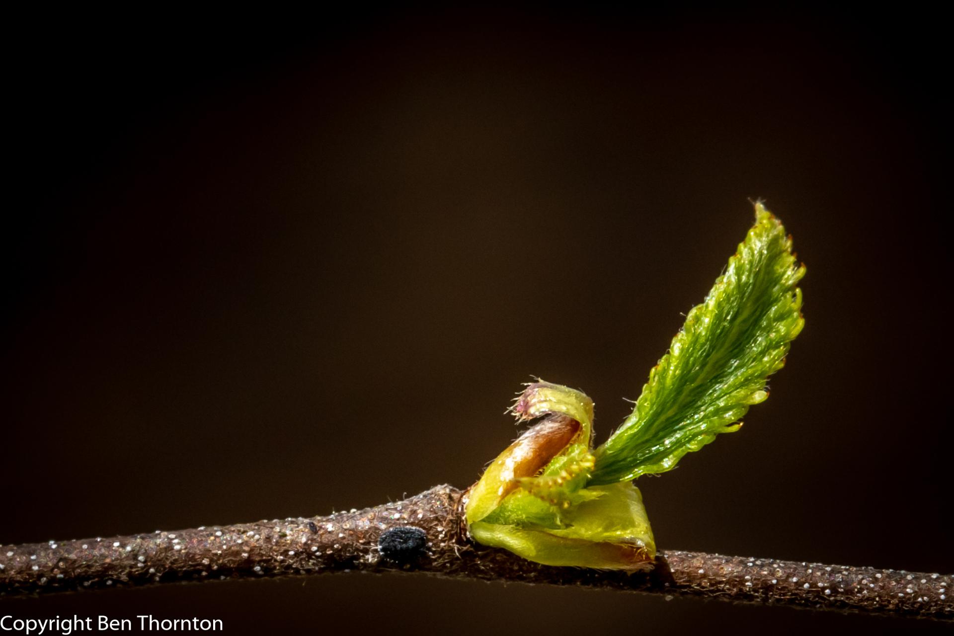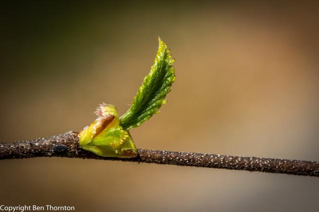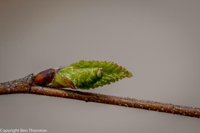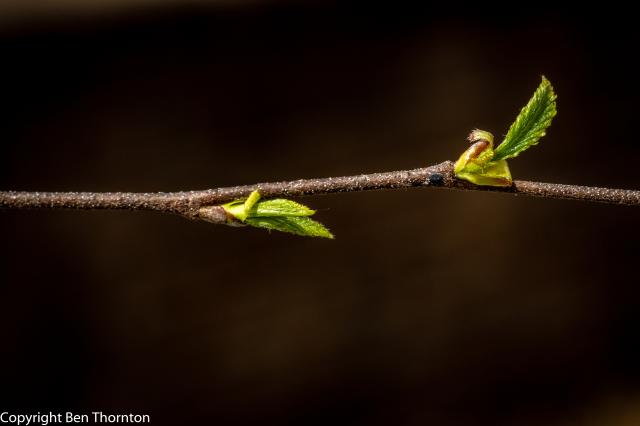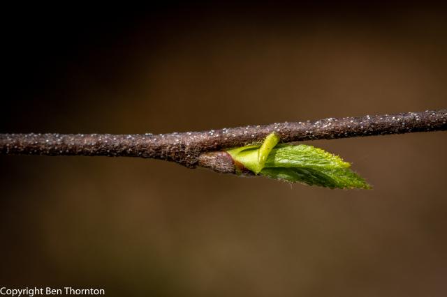 The twigs are glabrous or thinly hairy. There is an absence of terminal buds, and lateral buds often have a hook at the tip of the bud, which differs from other species in the family Betulaceae.[4] The leaves are alternate, ovate, 4–8 centimeters (1+1⁄23+1⁄4 in) long and 3–6 centimeters (1+1⁄42+1⁄4 in) broad, with a serrated margin and five to twelve pairs of veins. The upper surface of the leaf is dark green in color, while the underside can be described as having a light yellow-green color.[5] The leaves turn yellow in Autumn. The flowers are wind-pollinated catkins 3–6 centimeters (1+1⁄42+1⁄4 in) long, the male catkins pendulous, the female catkins erect. The fruit is unusual among birches in maturing in late spring; it is composed of numerous tiny winged seeds packed between the catkin bracts.[2][6]