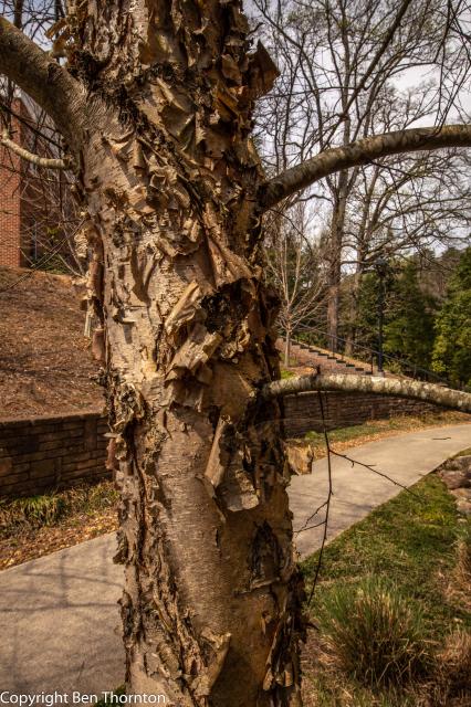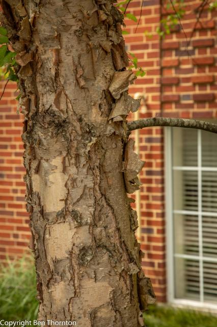 Bark characteristics of the river birch differ during its youth stage, maturation, and old growth. The bark of a young river birch can vary from having a salmon-pink to brown-gray tint and can be described as having loose layers of curling, paper thin scales. As the tree matures, the salmon-pink color is exchanged for a reddish-brown with a dark grey base color. The scales on a mature tree lack the loose curling and are closely pressed into thick, irregular plates. These scales are slightly separated from the trunk and can shift outward to the side. Once the river birch ages past maturity, the scales become thicker towards the base of the trunk and are divided in deep furrows.[3]