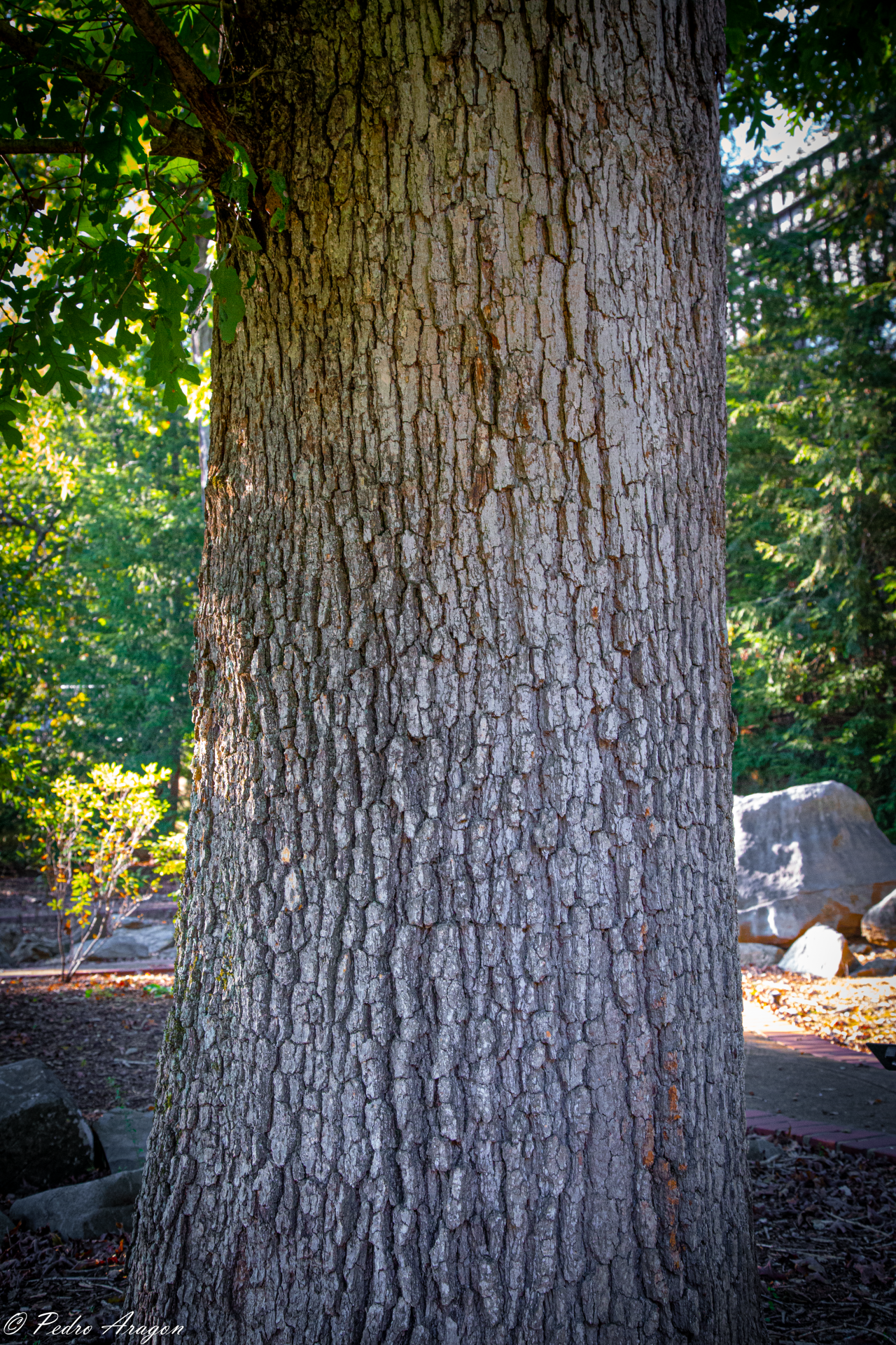 Although called a white oak, it is very unusual to find an individual specimen with white bark; the usual colour is a light grey. The name comes from the colour of the finished wood. In the forest it can reach a magnificent height and in the open it develops into a massive broad-topped tree with large branches striking out at wide angles.[5]