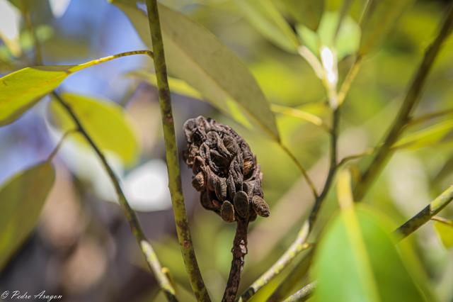 The flowers are creamy white, 8–14 cm diameter, with 6-15 petal-like TEPALS. The flowers carry a very strong vanilla scent that can sometimes be noticed several hundred yards away. The fruit is a fused aggregate of follicles, 3–5 cm long, pinkish-red when mature, with the follicles splitting open to release the 1 cm long seeds. The SEEDS are black but covered by a thinly fleshy red coat, which is attractive to some FRUIT-eating BIRDS; these swallow the seeds, digest the red coating, and disperse the seeds in their droppings.