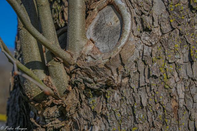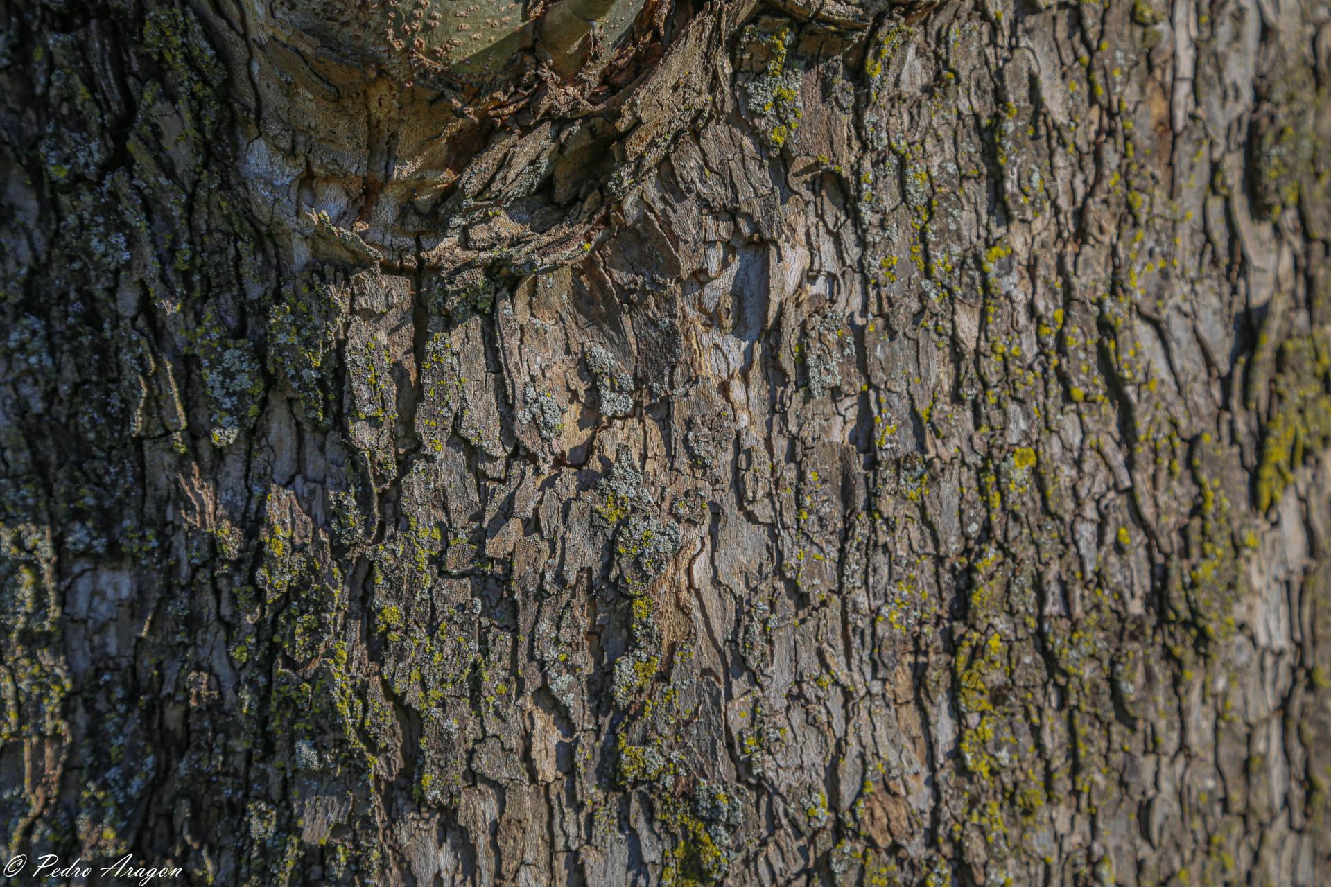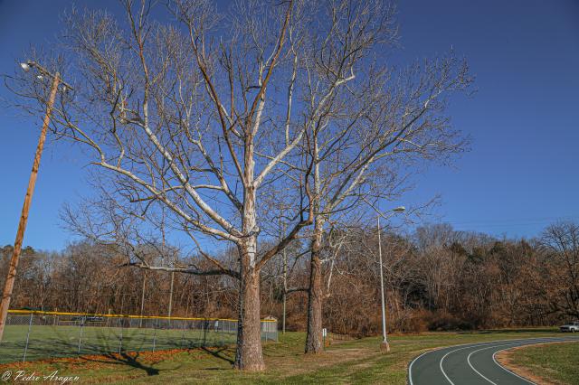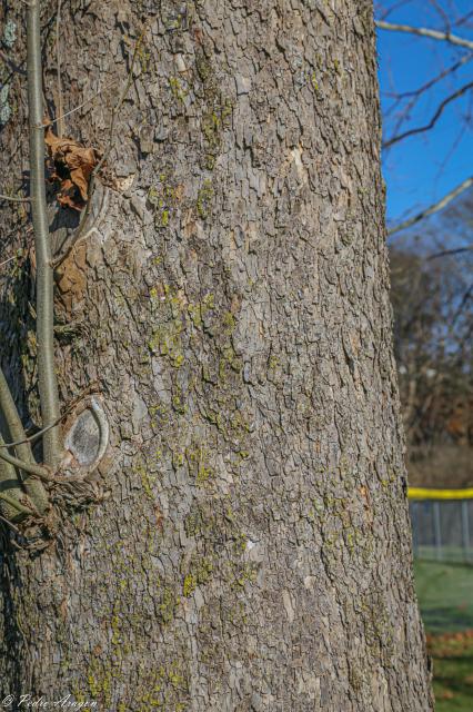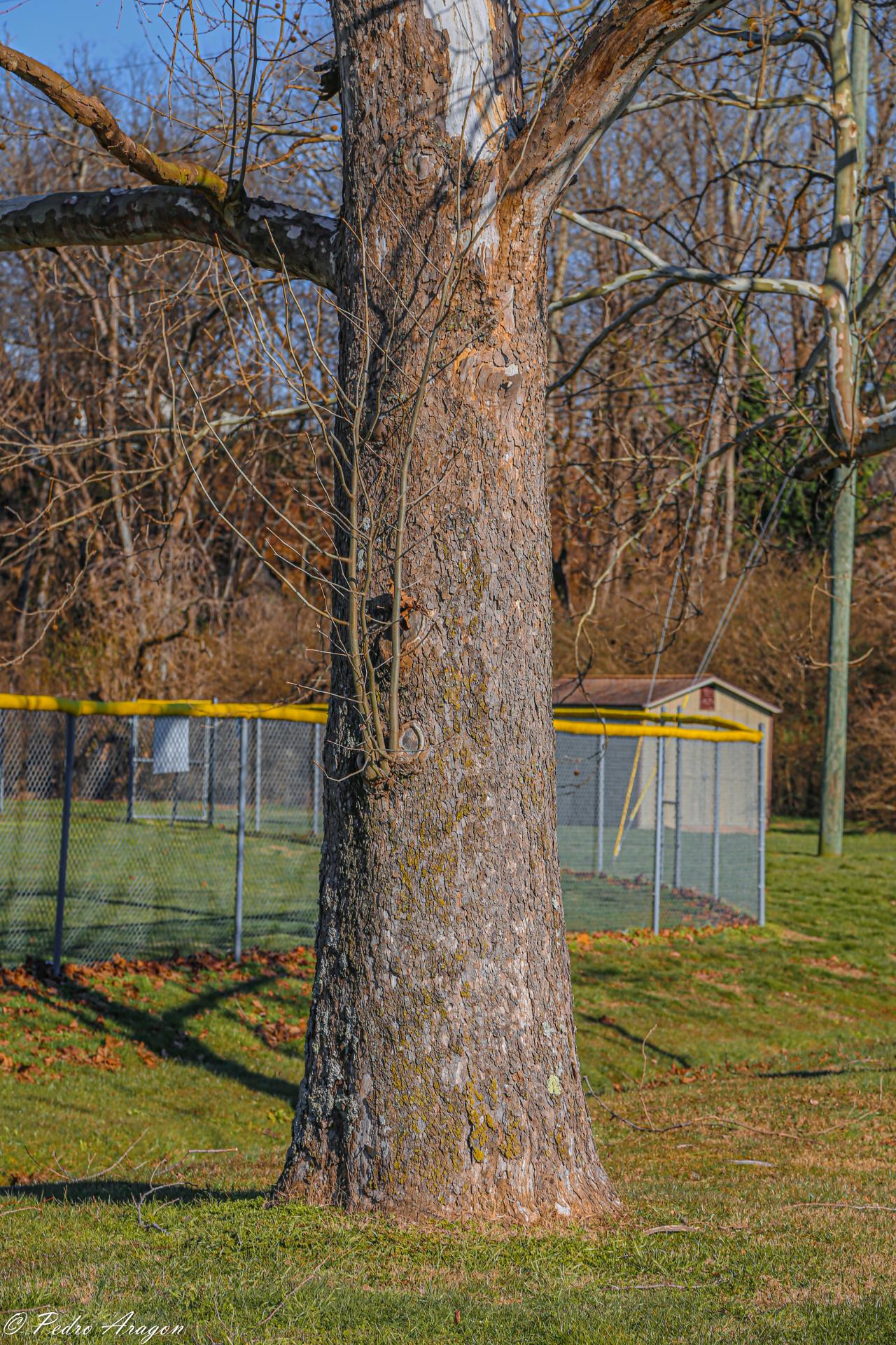 An American sycamore tree can often be easily distinguished from other trees by its mottled bark which flakes off in large irregular masses, leaving the surface mottled and gray, greenish-white and brown. The bark of all trees has to yield to a growing trunk by stretching, splitting, or infilling. The sycamore shows the process more openly than many other trees. The explanation is found in the rigid texture of the bark tissue which lacks the elasticity of the bark of some other trees, so it is incapable of stretching to accommodate the growth of the wood underneath, so the tree sloughs it off.[7]