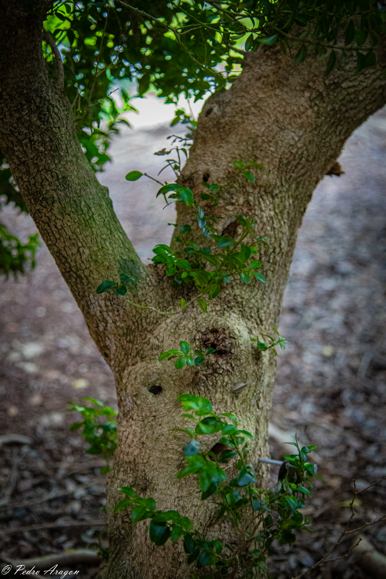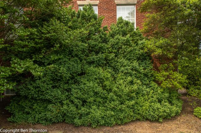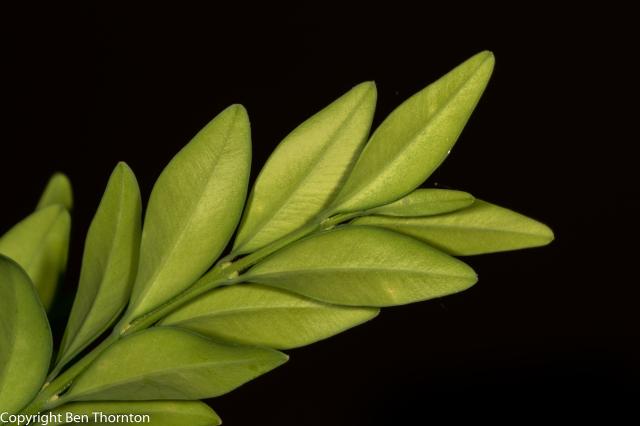 Buxus sempervirensis an evergreenshrub or small tree growing up to 1 to9 m(3 to30 ft) tall, with a trunk up to 20 centimetres (8in) in diameter (exceptionally to 10m tall and 45cm diameter[6]). Arranged in opposite pairs along the stems, the leaves are green to yellow-green, oval, 1.5–3cm long, and 0.5–1.3cm broad. The hermaphrodite flowers are inconspicuous but highly scented, greenish-yellow, with no petals, and are insect pollinated; the fruit is a three-lobed capsule containing 3-6 seeds.[1][3]