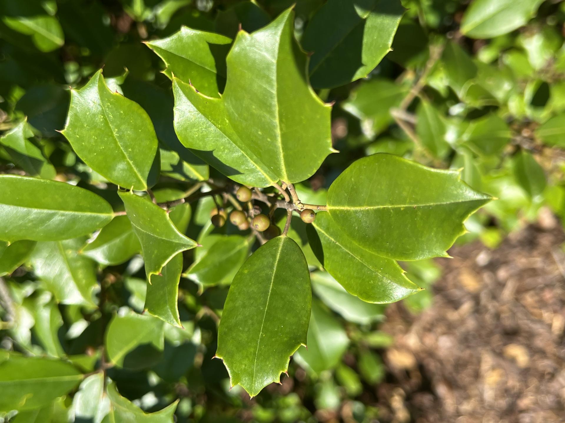 The leaves are alternate, 5–7.5cm (2.0–3.0in) long and 2–4cm (0.79–1.57in) wide, stiff, yellow green and dull matte to sub-shiny above (distinctly less glossy than the otherwise fairly similar European hollyIlex aquifolium[6]), often pale yellow beneath; the edges are curved into several sharp, spike-like points, and a wedge-shaped base andacute apex; themidribis prominent and depressed, the primary veins conspicuous; thepetioleis short, stout, grooved, thickened at base, with a pair of minutestipules. The leaves remain on the branches for two to three years, finally falling in the spring when pushed off by growing buds.[4][7][8]