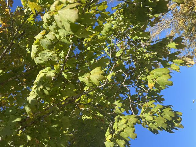 It is a medium-sized to largedeciduoustree, growing to 15–25 m (exceptionally to 38 m) tall, with an elliptical crown of moderate density with a smooth or rounded outline. Thebarkis a light gray with thick irregular curling ridges; as the tree matures, the bark tends to become plated. Thetwigsare slender, somewhat shiny, reddish brown. The terminalbudsare sharply pointed, brown and pubescent. Theleavesare opposite, simple, palmately lobed and veined, 3–9.5cm long and 3.5–11cm broad, with an entire margin and three or five somewhat rounded lobes, and a 2–8cm longpetiole. They are green above and paler and pubescent below. In fall they turn orange and yellow. Theflowersare regular, pentamerous, and appear on yellow-greencorymbsand are quite small. They hang from puberulentpedicels2.4–5cm long in clusters of a few flowers, appearing before or with the leaves in early spring. This is about two weeks prior to the maturation of the flowers ofAcer saccharum. The tree is generallydiecious, though they are often also polygamous, that is having bisexual and unisexual flowers on the same individual. Thefruitis a pairedsamara1.5–3cm long.[5][6]