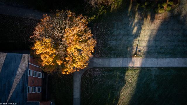 The LEAVES are deciduous, up to 20 cm (7.9 in) long and wide,[8] palmate, with five lobes and borne in opposite pairs. The basal lobes are relatively small, while the upper lobes are larger and deeply notched. In contrast with the angular notching of the SILVER MAPLE, however, the notches tend to be rounded at their interior. The fall color is often spectacular, ranging from bright yellow on some trees through orange to fluorescent red-orange on others. Sugar maples also have a tendency to color unevenly in fall. In some trees, all colors above can be seen at the same time. They also share a tendency with RED MAPLES for certain parts of a mature tree to change color weeks ahead of or behind the remainder of the tree. The leaf buds are pointy and brown-colored. The recent year's growth twigs are green, and turn dark brown.[CITATION NEEDED]