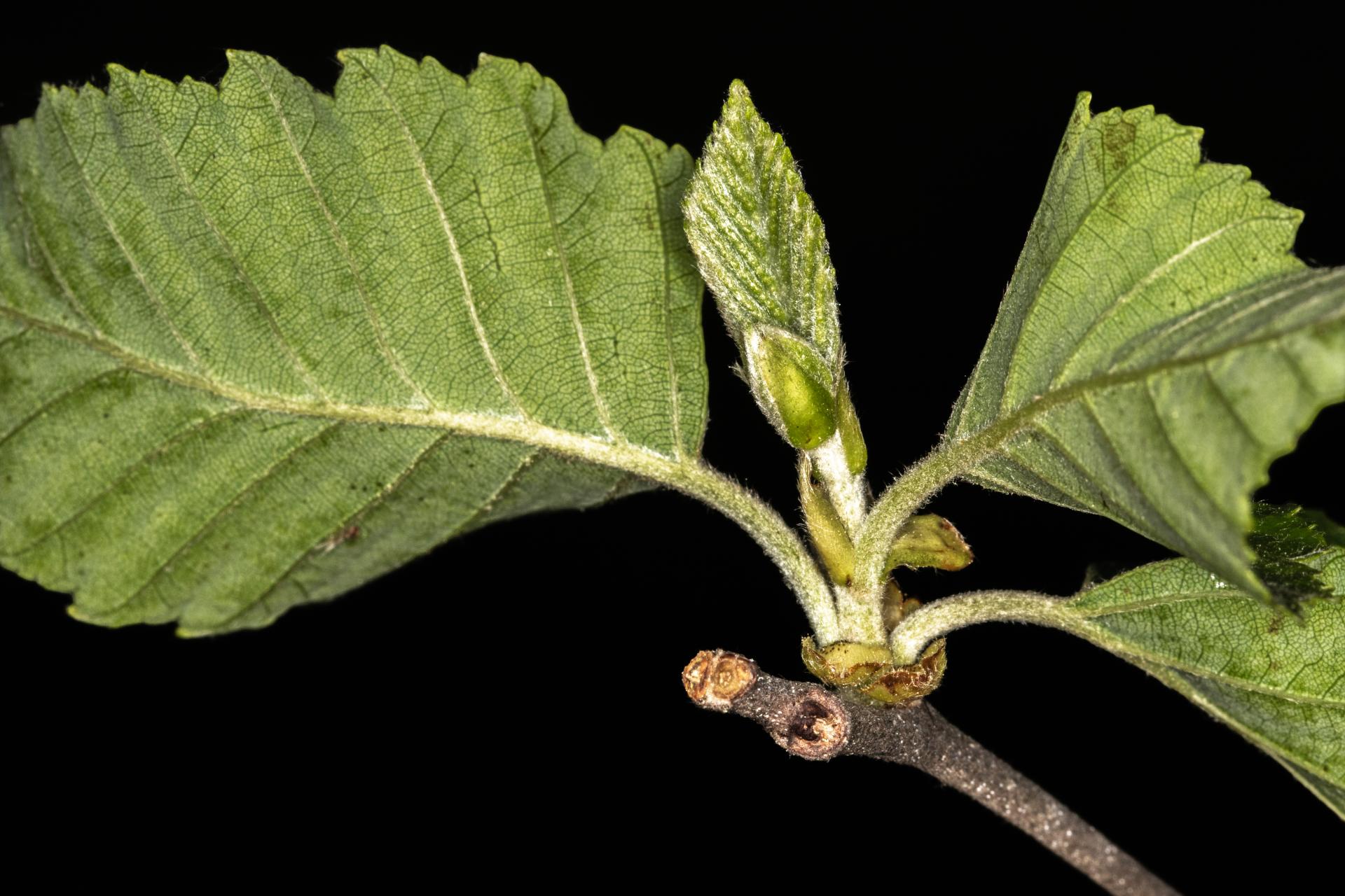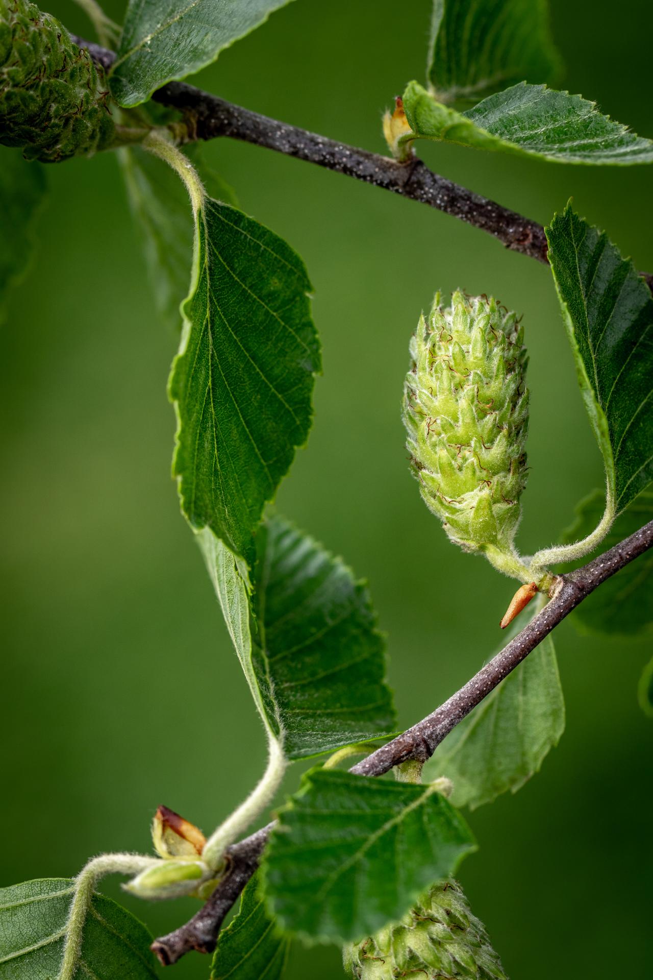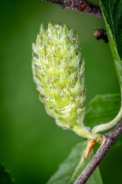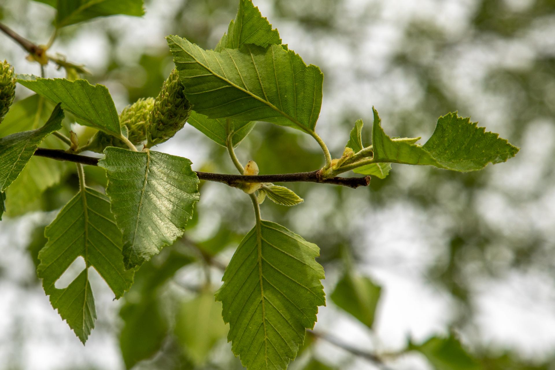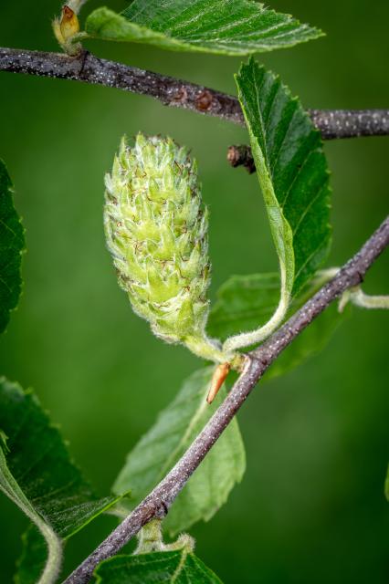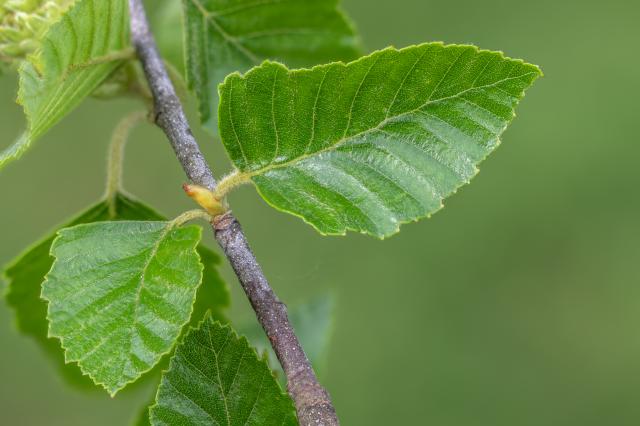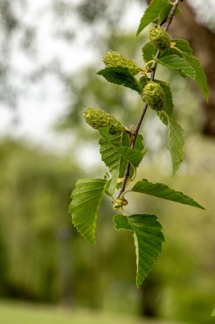 The twigs are glabrous or thinly hairy. There is an absence of terminal buds, and lateral buds often have a hook at the tip of the bud, which differs from other species in the family Betulaceae.[4] The leaves are alternate, ovate, 4–8 centimeters (1+1⁄2–3+1⁄4 in) long and 3–6 centimeters (1+1⁄4–2+1⁄4 in) broad, with a serrated margin and five to twelve pairs of veins. The upper surface of the leaf is dark green in color, while the underside can be described as having a light yellow-green color.[5] The leaves turn yellow in Autumn. The flowers are wind-pollinated catkins 3–6 centimeters (1+1⁄4–2+1⁄4 in) long, the male catkins pendulous, the female catkins erect. The fruit is unusual among birches in maturing in late spring; it is composed of numerous tiny winged seeds packed between the catkin bracts.[2][6]