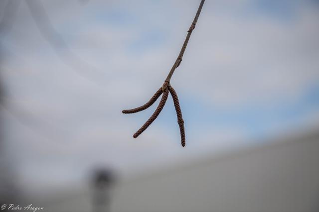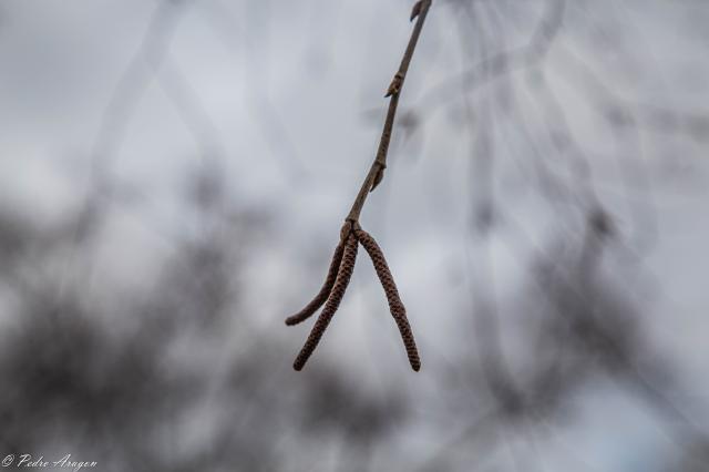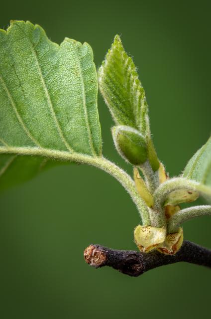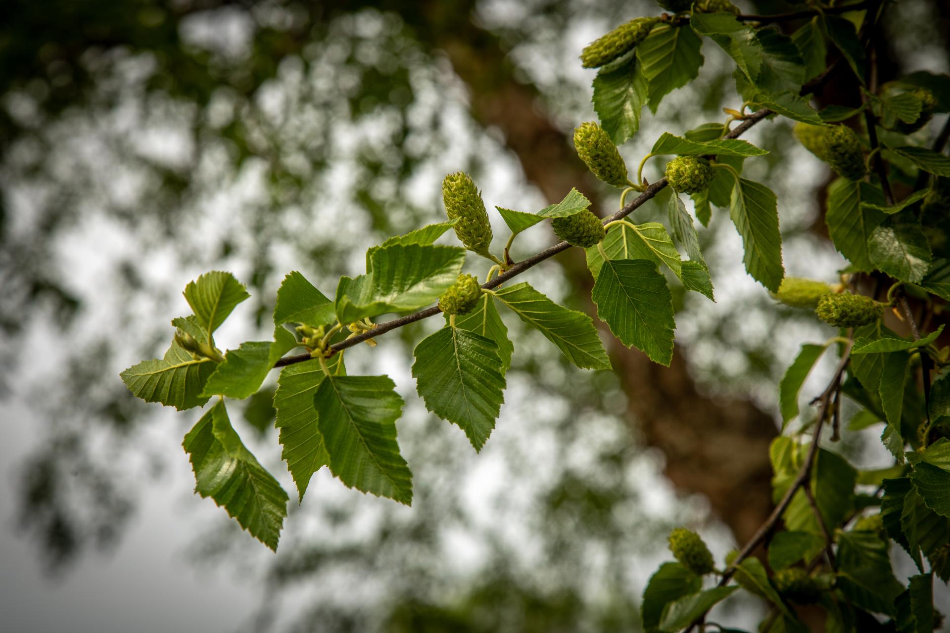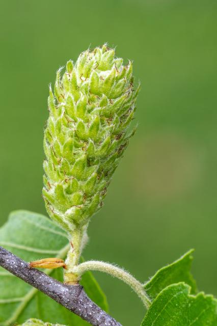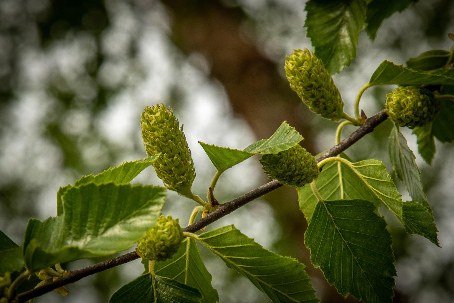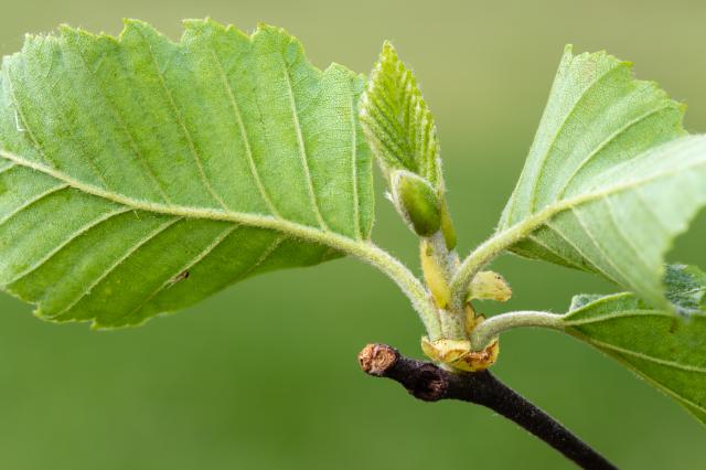 The twigs are glabrous or thinly hairy. There is an absence of terminal buds, and lateral buds often have a hook at the tip of the bud, which differs from other species in the family Betulaceae.[4] The leaves are alternate, ovate, 4–8 centimeters (1+1⁄2–3+1⁄4 in) long and 3–6 centimeters (1+1⁄4–2+1⁄4 in) broad, with a serrated margin and five to twelve pairs of veins. The upper surface of the leaf is dark green in color, while the underside can be described as having a light yellow-green color.[5] The leaves turn yellow in Autumn. The flowers are wind-pollinated catkins 3–6 centimeters (1+1⁄4–2+1⁄4 in) long, the male catkins pendulous, the female catkins erect. The fruit is unusual among birches in maturing in late spring; it is composed of numerous tiny winged seeds packed between the catkin bracts.[2][6]