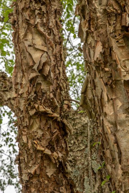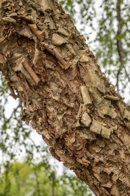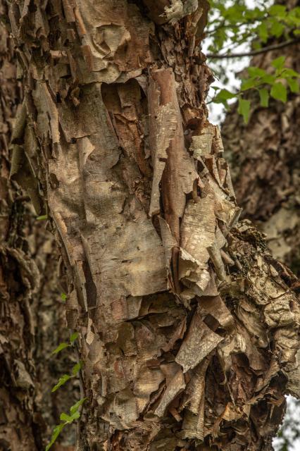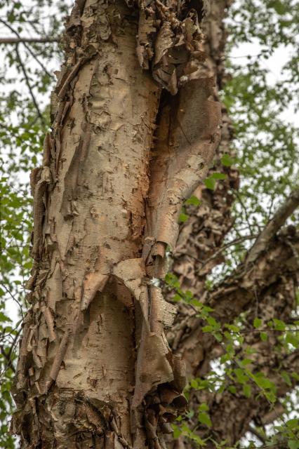 Bark characteristics of the river birch differ during its youth stage, maturation, and old growth. The bark of a young river birch can vary from having a salmon-pink to brown-gray tint and can be described as having loose layers of curling, paper thin scales. As the tree matures, the salmon-pink color is exchanged for a reddish-brown with a dark grey base color. The scales on a mature tree lack the loose curling and are closely pressed into thick, irregular plates. These scales are slightly separated from the trunk and can shift outward to the side. Once the river birch ages past maturity, the scales become thicker towards the base of the trunk and are divided in deep furrows.[3]