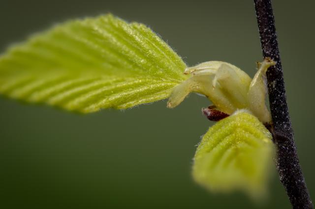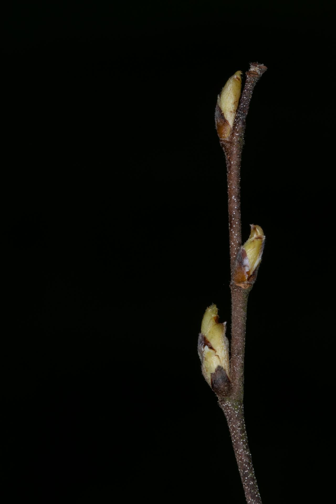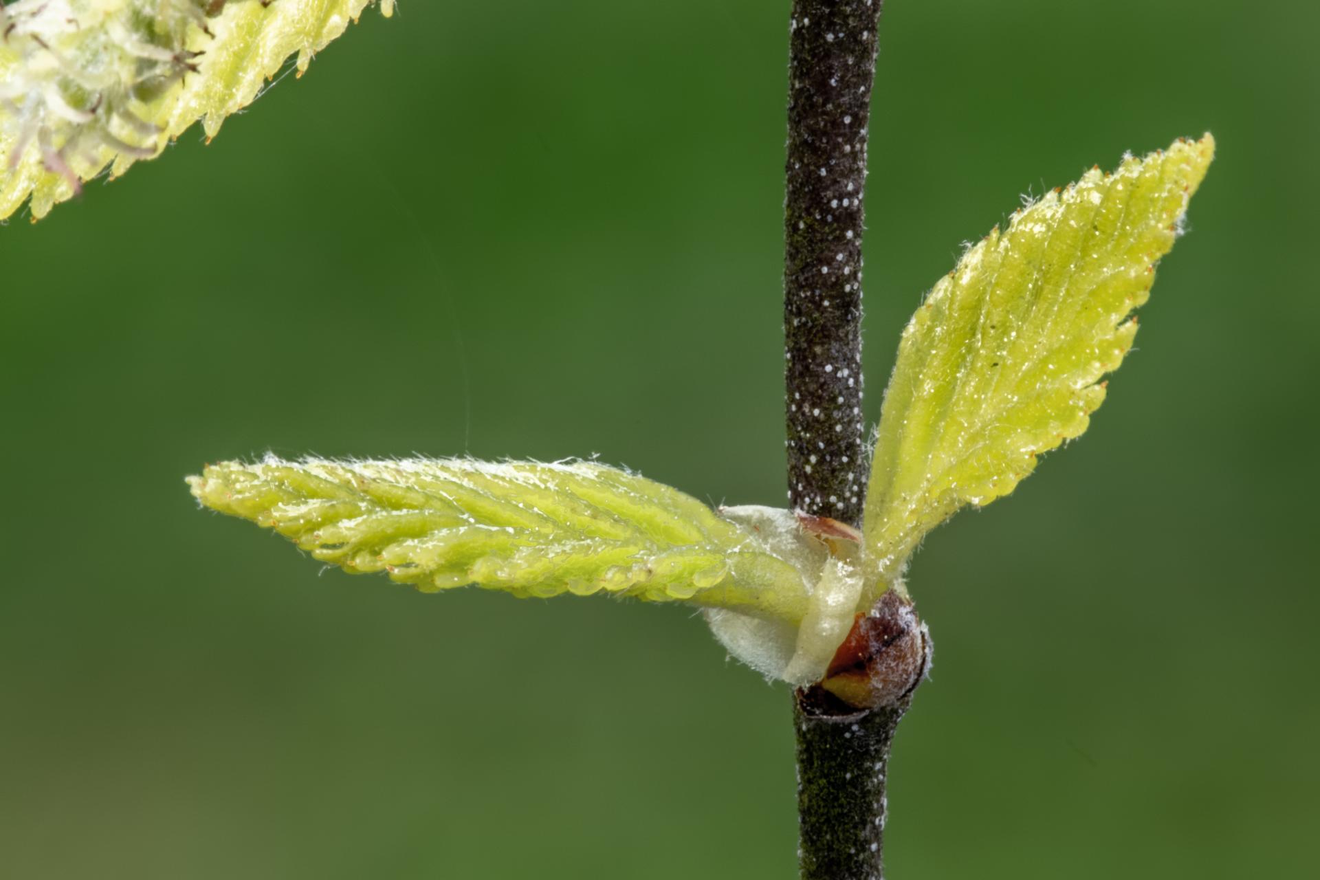 The twigs are glabrous or thinly hairy. There is an absence of terminal buds, and lateral buds often have a hook at the tip of the bud, which differs from other species in the family Betulaceae.[4] The leaves are alternate, ovate, 4–8 centimeters (1+123+14 in) long and 3–6 centimeters (1+142+14 in) broad, with a serrated margin and five to twelve pairs of veins. The upper surface of the leaf is dark green in color, while the underside can be described as having a light yellow-green color.[5] The leaves turn yellow in Autumn. The flowers are wind-pollinated catkins 3–6 centimeters (1+142+14 in) long, the male catkins pendulous, the female catkins erect. The fruit is unusual among birches in maturing in late spring; it is composed of numerous tiny winged seeds packed between the catkin bracts.[2][6]