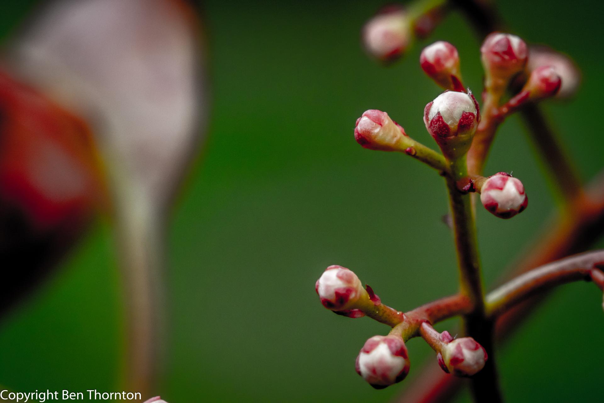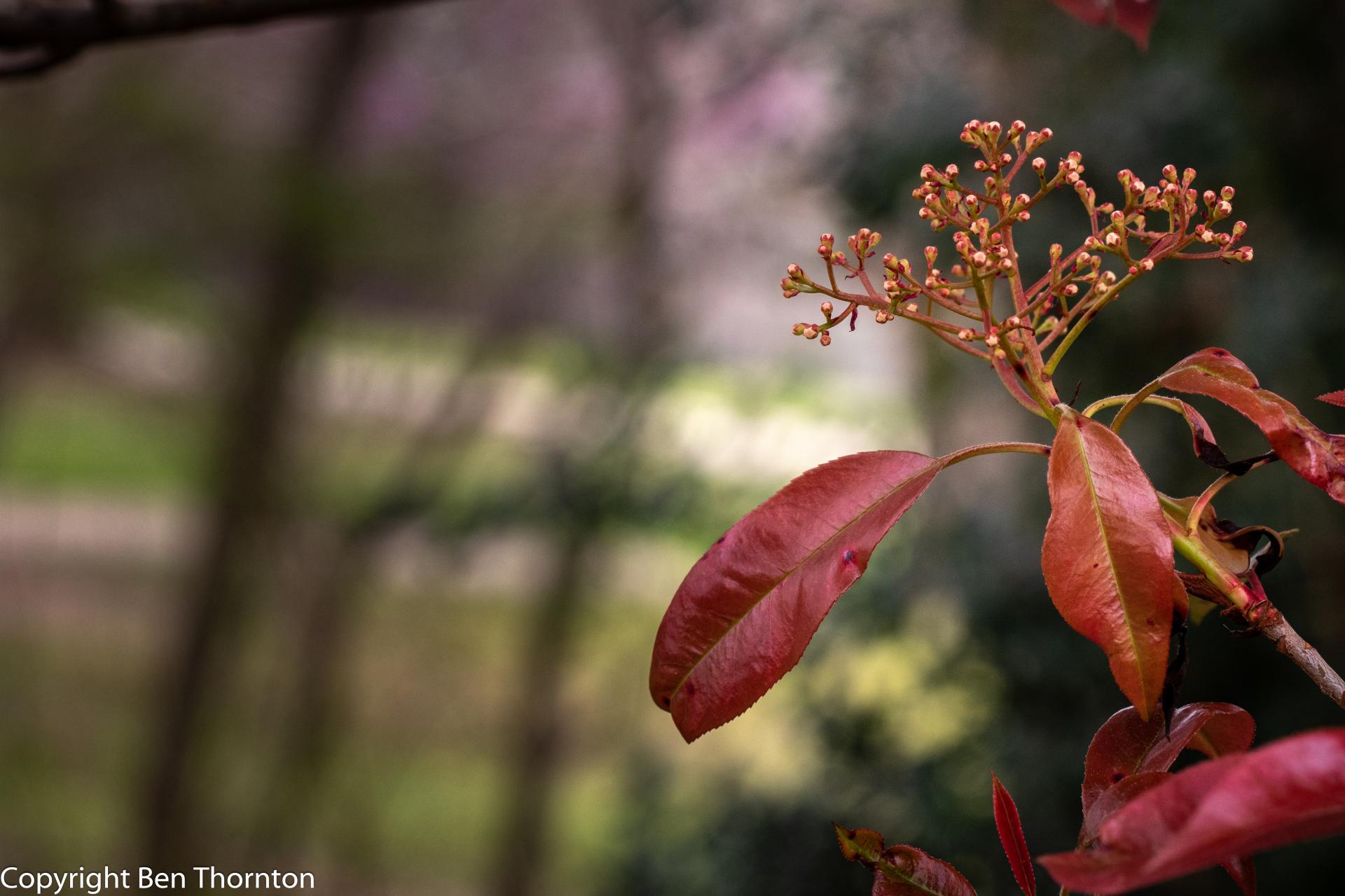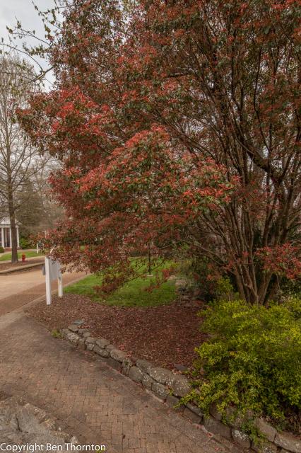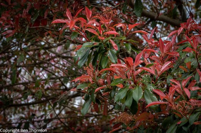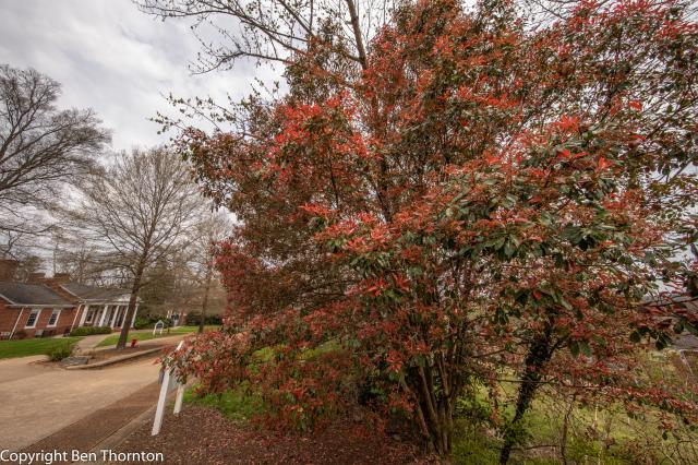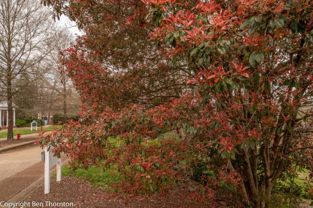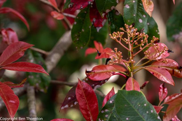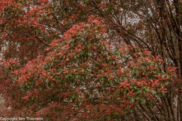 Photinia × fraseri is a large, hybrid (P. glabra and P. serrulata), evergreen shrub that typically grows to 10-15' tall and as wide. It is often commonly called red tip or red top (particularly in the deep South where it has been frequently planted) in celebration of the bronze red to bright red new leaves that emerge at the twig tips each spring. This hybrid was originally discovered at Fraser Nursery in Birmingham, Alabama around 1940, and was subsequently introduced into commerce in 1955 as Photina × fraseri 'Birmingham' ('Birmingham' was later dropped). Leathery, elliptic to oval, dark green leaves (to 3-4" long) with finely serrated margins are evergreen. New growth in spring emerges bronze- to copper-red in a showy display lasting about 2-3 weeks. Red leaves gradually change to glossy dark green. Additional pruning may encourage new flushes of red leaves in late spring and summer. Small, 5-petaled, white flowers (1/3" across) of this rose family shrub bloom in late April in wide, corymbose panicles (to 5-6" long). Flowers have a very unpleasant aroma, somewhat reminiscent of hawthorns. Flowers may be eliminated by spring pruning geared to stimulate new red leaf growth. Fruit is a red pome that persists throughout winter to spring.