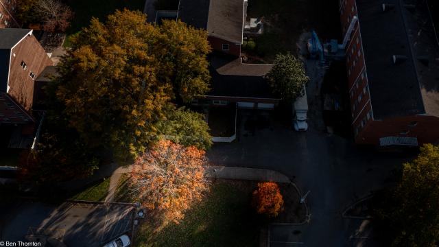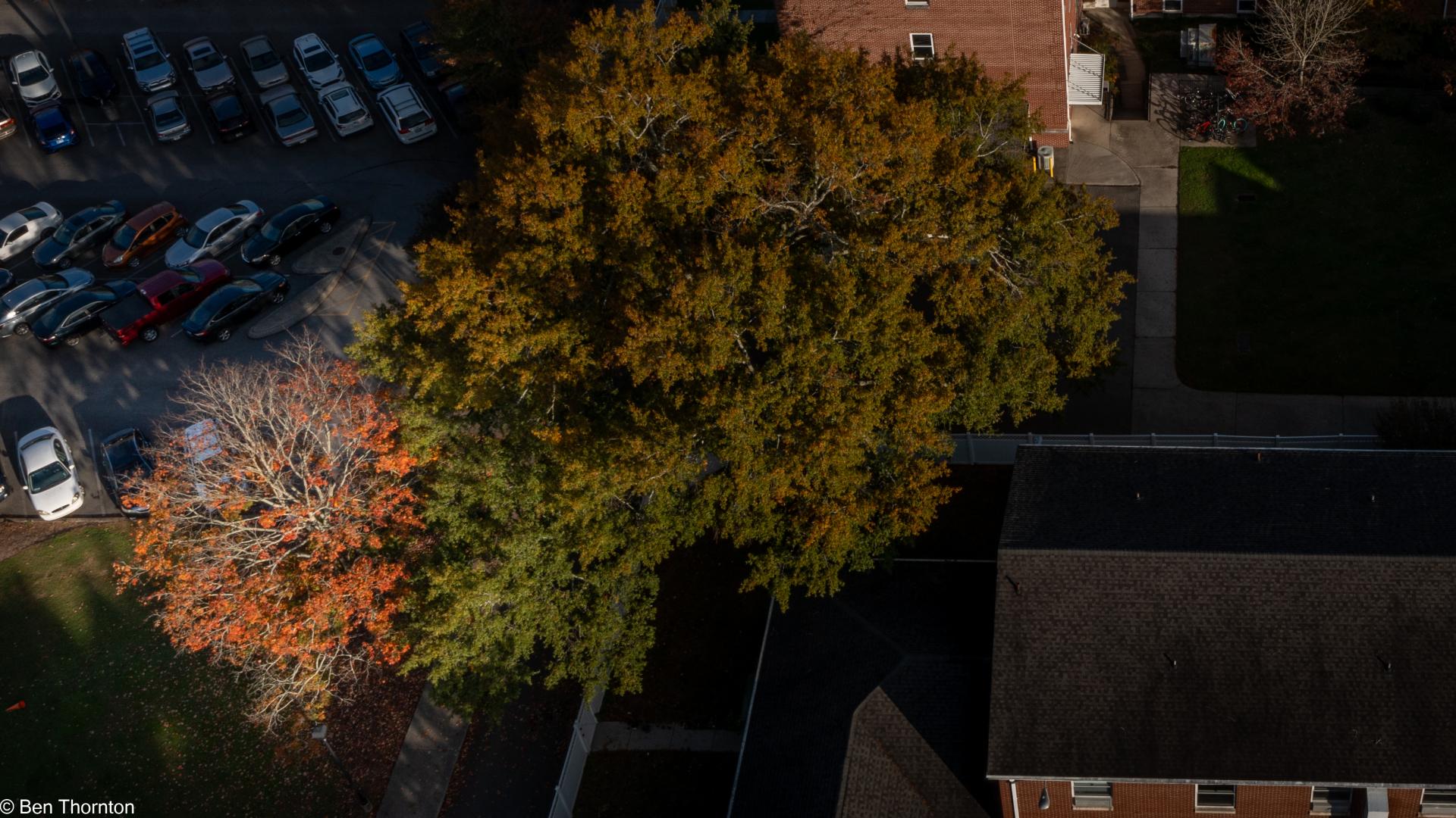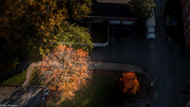 The LEAVES are deciduous, up to 20 cm (7.9 in) long and wide,[8] palmate, with five lobes and borne in opposite pairs. The basal lobes are relatively small, while the upper lobes are larger and deeply notched. In contrast with the angular notching of the SILVER MAPLE, however, the notches tend to be rounded at their interior. The fall color is often spectacular, ranging from bright yellow on some trees through orange to fluorescent red-orange on others. Sugar maples also have a tendency to color unevenly in fall. In some trees, all colors above can be seen at the same time. They also share a tendency with RED MAPLES for certain parts of a mature tree to change color weeks ahead of or behind the remainder of the tree. The leaf buds are pointy and brown-colored. The recent year's growth twigs are green, and turn dark brown.[CITATION NEEDED]