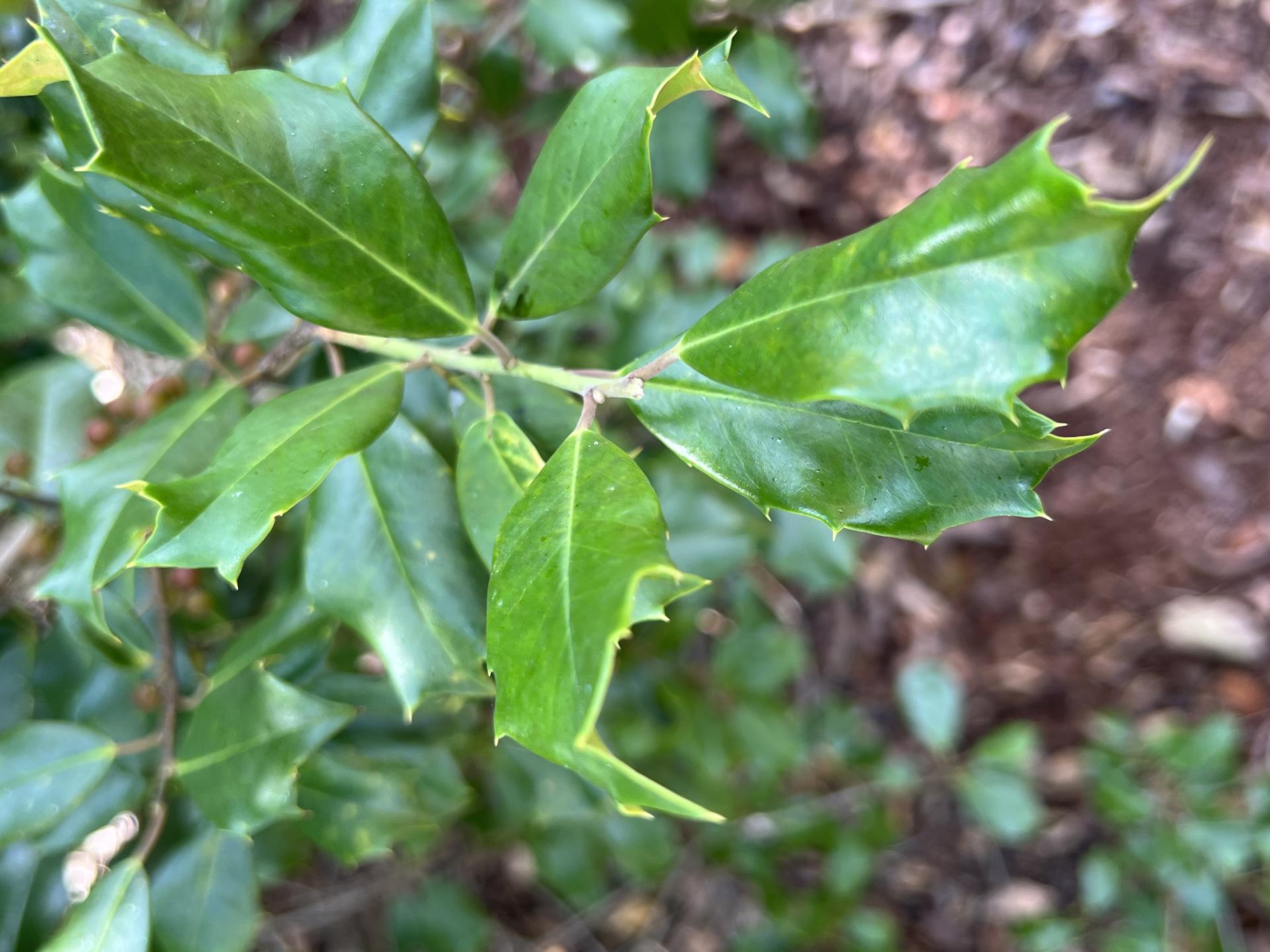 The leaves are alternate, 5–7.5cm (2.0–3.0in) long and 2–4cm (0.79–1.57in) wide, stiff, yellow green and dull matte to sub-shiny above (distinctly less glossy than the otherwise fairly similar European hollyIlex aquifolium[6]), often pale yellow beneath; the edges are curved into several sharp, spike-like points, and a wedge-shaped base andacute apex; themidribis prominent and depressed, the primary veins conspicuous; thepetioleis short, stout, grooved, thickened at base, with a pair of minutestipules. The leaves remain on the branches for two to three years, finally falling in the spring when pushed off by growing buds.[4][7][8]