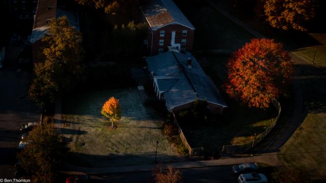 The LEAVES are deciduous, up to 20 cm (7.9 in) long and wide,[8] palmate, with five lobes and borne in opposite pairs. The basal lobes are relatively small, while the upper lobes are larger and deeply notched. In contrast with the angular notching of the SILVER MAPLE, however, the notches tend to be rounded at their interior. The fall color is often spectacular, ranging from bright yellow on some trees through orange to fluorescent red-orange on others. Sugar maples also have a tendency to color unevenly in fall. In some trees, all colors above can be seen at the same time. They also share a tendency with RED MAPLES for certain parts of a mature tree to change color weeks ahead of or behind the remainder of the tree. The leaf buds are pointy and brown-colored. The recent year's growth twigs are green, and turn dark brown.[CITATION NEEDED]