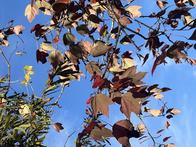 The LEAVES of the red maple offer the easiest way to distinguish it from its relatives. As with all North American maple trees, they are DECIDUOUS and arranged oppositely on the twig. They are typically 5–10 cm (2–4 in) long and wide with three to five PALMATE LOBES with a serrated margin. The SINUSES are typically narrow, but the leaves can exhibit considerable variation.[6] When five lobes are present, the three at the terminal end are larger than the other two near the base. In contrast, the leaves of the related SILVER MAPLE, A. saccharinum, are much more deeply lobed, more sharply toothed, and characteristically have five lobes. The upper side of A. rubrum's leaf is light green and the underside is whitish and can be either GLAUCOUS or hairy. The leaf stalks are usually red and are up to 10 cm (4 in) long. The leaves can turn a characteristic brilliant red in autumn, but can also become yellow or orange on some individuals. Soil acidity can influence the color of the foliage and trees with female flowers are more likely to produce orange coloration while male trees produce red. The FALL COLORS of red maple are most spectacular in the northern part of its range where climates are cooler.