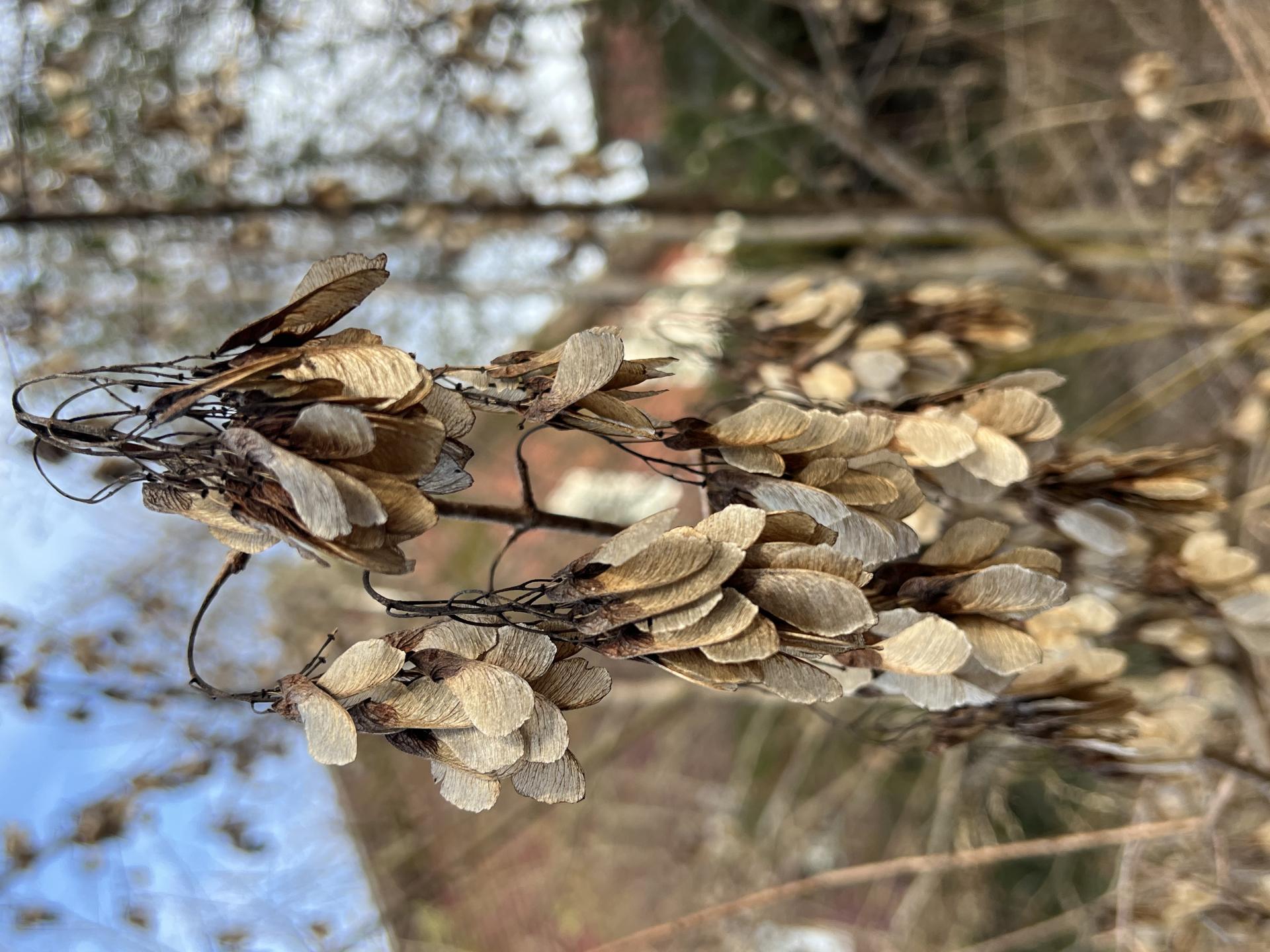 Acer ginnala is a deciduous spreading shrub or small tree growing to 3–10 m (9.8–32.8 ft) tall, with a short trunk up to 20–40 cm (8–16 in) diameter and slender branches. The bark is thin, dull gray-brown, and smooth at first but becoming shallowly fissured on old plants. The leaves are opposite and simple, 4–10 cm (1+1⁄2–4 in) long and 3–6 cm (1+1⁄4–2+1⁄4 in) wide, deeply palmately lobed with three or five lobes, of which two small basal lobes (sometimes absent) and three larger apical lobes; the lobes are coarsely and irregularly toothed, and the upper leaf surface glossy. The leaves turn brilliant orange to red in autumn, and are on slender, often pink-tinged, petioles 3–5 cm (1+1⁄4–2 in) long. The flowers are yellow-green, 5–8 mm (0.20–0.31 in) diameter, produced in spreading panicles in spring as the leaves open. The fruit is a paired reddish samara, 8–10 mm (0.31–0.39 in) long with a 1.5–2 cm (5⁄8–3⁄4 in) wing, maturing in late summer to early autumn.[1]