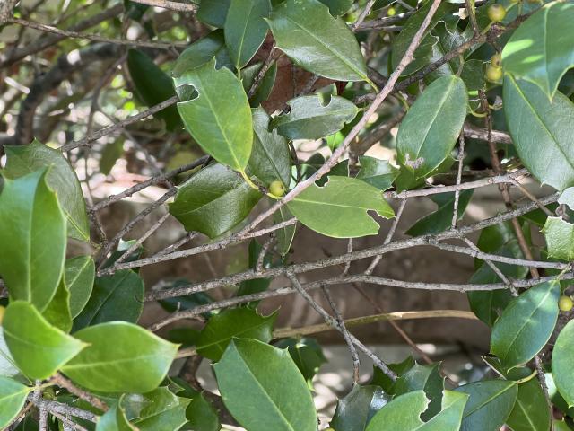 The leaves are alternate, 5–7.5cm (2.0–3.0in) long and 2–4cm (0.79–1.57in) wide, stiff, yellow green and dull matte to sub-shiny above (distinctly less glossy than the otherwise fairly similar European hollyIlex aquifolium[6]), often pale yellow beneath; the edges are curved into several sharp, spike-like points, and a wedge-shaped base andacute apex; themidribis prominent and depressed, the primary veins conspicuous; thepetioleis short, stout, grooved, thickened at base, with a pair of minutestipules. The leaves remain on the branches for two to three years, finally falling in the spring when pushed off by growing buds.[4][7][8]