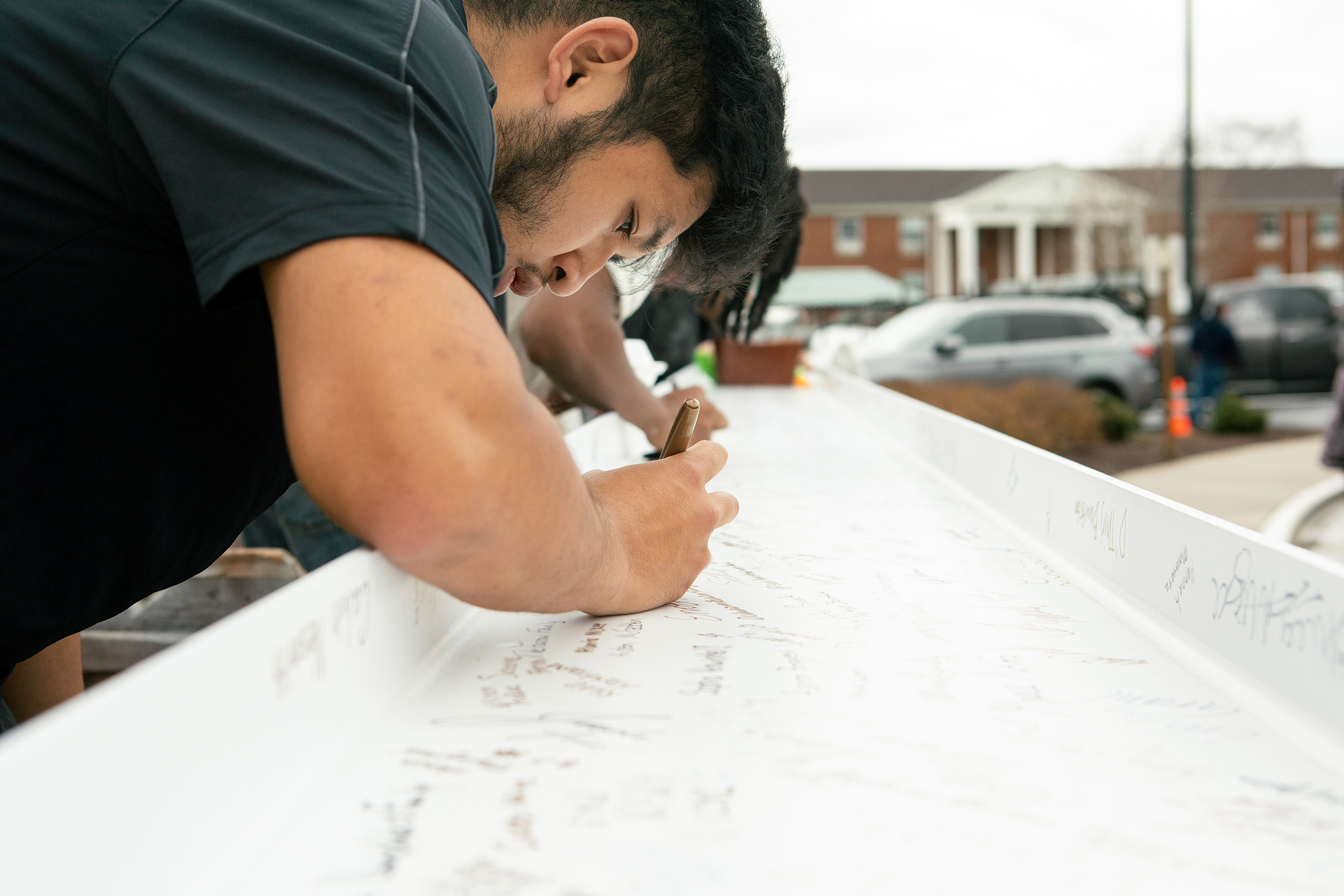 Southern Adventist University staff, alumni, students, and community members participated in a unique twist on a traditional topping-out ceremony on March 5—signing one of the final beams for the new Ruth McKee School of Business building.