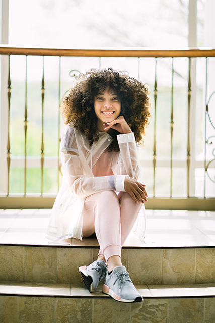 After I wash, I use an oversized t-shirt to dry my hair. This helps cut down on the frizziness that towel drying can cause. I always use a leave-in conditioner. For the past semester, I’ve been using Shea Moisture’s 100% Virgin Coconut Oil Leave-in Treatment—it smells great and leaves my hair feeling moisturized. I never comb my hair after showering. This allows my natural pattern to form. Then I use DevaCurl’s Frizz-Free Volumizing Foam and B’Leave-in Miracle Curl Plumper throughout. These products help fight frizz and also give my waves and curls some hold so they last and keep their shape. Then I sleep on my wet hair and wake up in the morning ready to go!